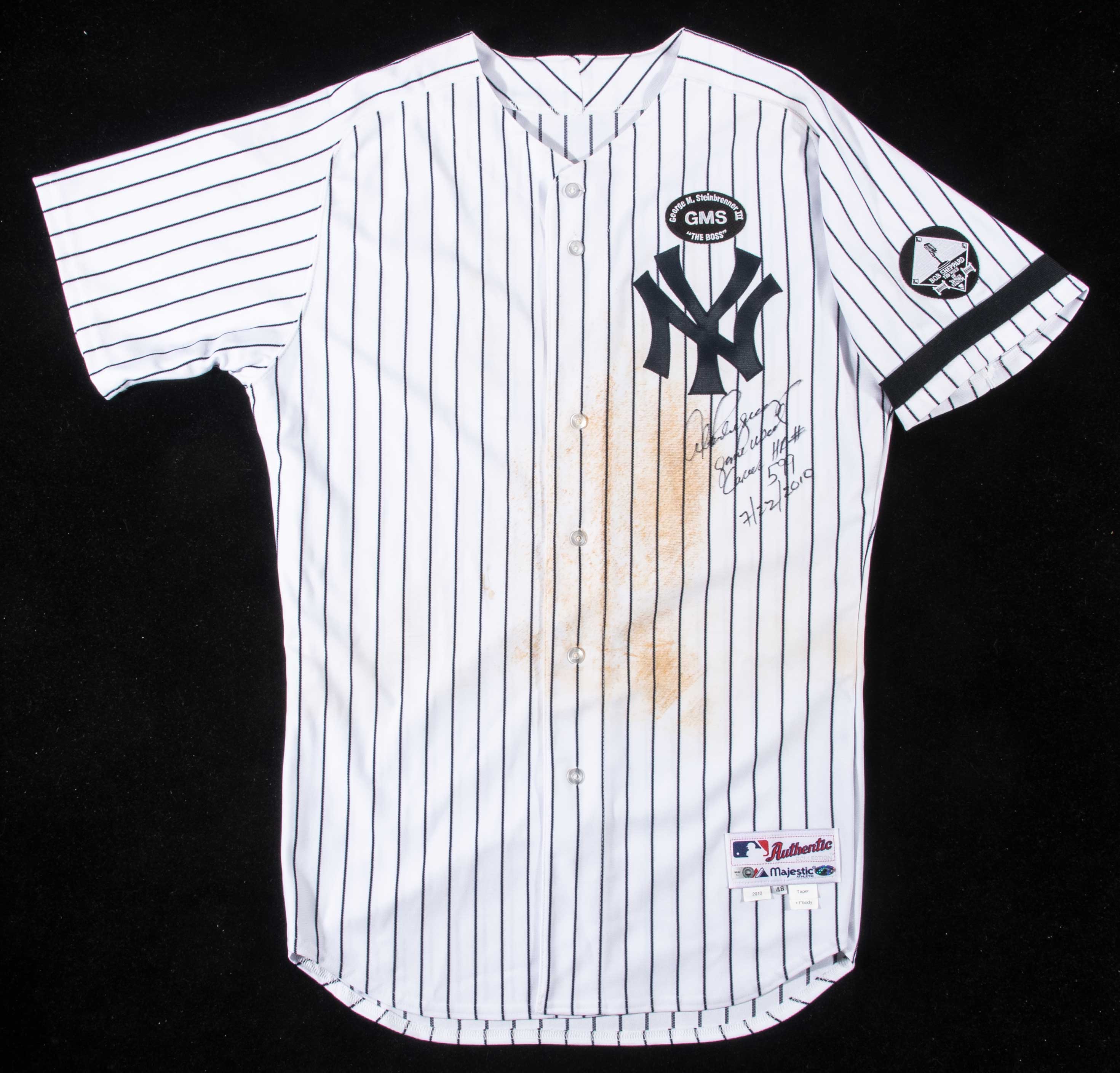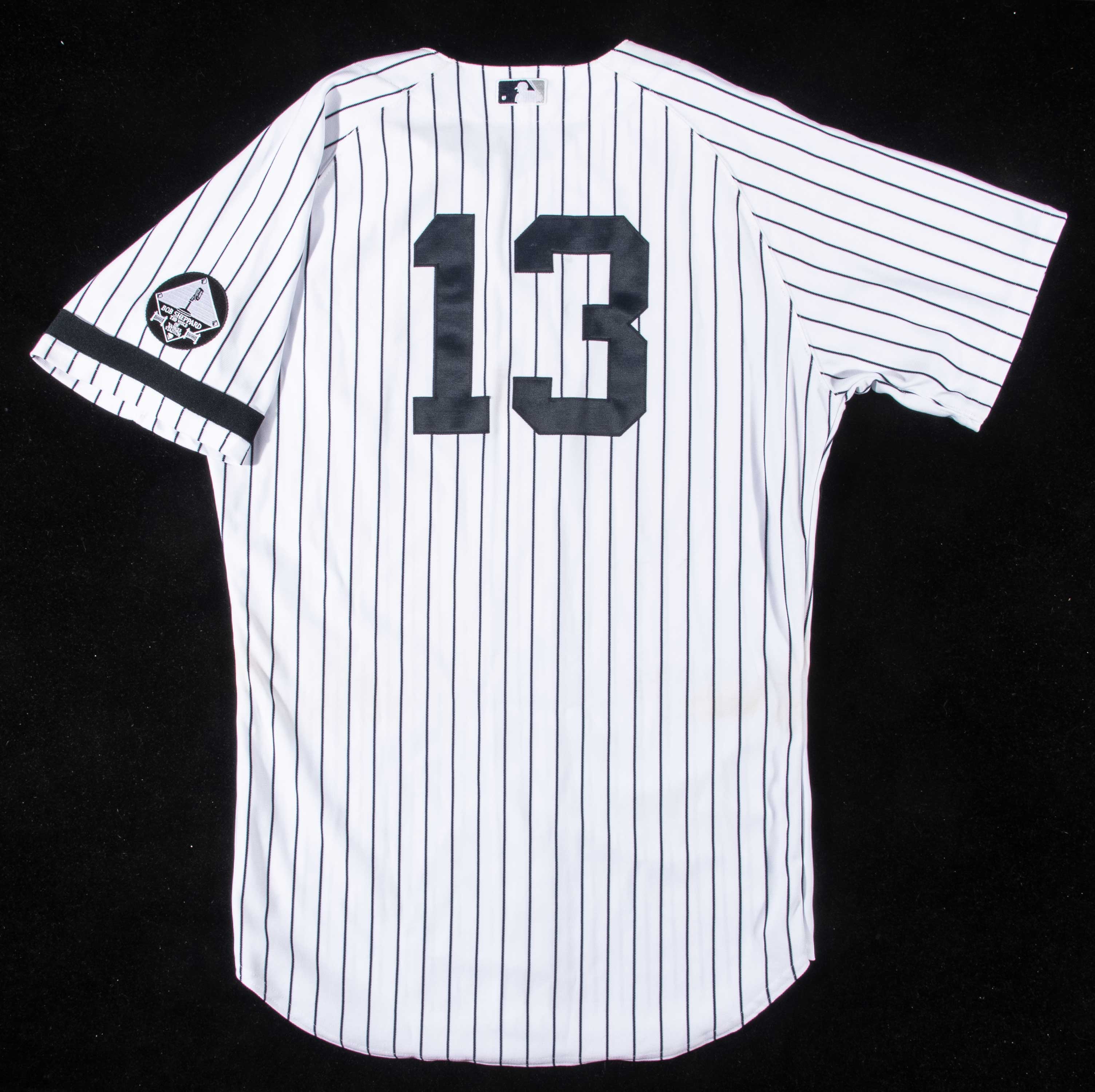 Description:July 22, 2010 Alex Rodriguez 599th career home run game used and autographed New York Yankees jersey. Pinstriped jersey has the famed "NY" logo on left front chest with a "GMS George M. Steinbrenner III The Boss" memorial patch above and player number "13" appears on the back. A black armband is on the left sleeve (worn in honor of Ralph Houk) along with a "Bob Sheppard" patch. Majestic tag on the front tail has adjacent size (48), year "2010", and custom "Taper" and "+1 Body" flag tags. Affixed to the Majestic tag are MLB and ARod authentication holograms. The MLB Hologram (FJ095767) confirms that Rodriguez wore the jersey on July 22, 2010 to hit his 599th career home run in the bottom of the 7th inning in the Yankees home game vs. Toronto. He has signed the jersey on the front, "Alex Rodriguez, game used career HR #599 7/22/2010" in marker rating 8 out of 10. Strong use is evident throughout with dirt stains on the front. Both the positioning of the stain and alignment of the Yankees logo/patches are a spot on match to image of ARod taken during the game. An historic piece of game equipment as worn by one of the premier players of the generation. Includes Rodriguez signed letter of authenticity and LOA from Hunt Auctions: EX