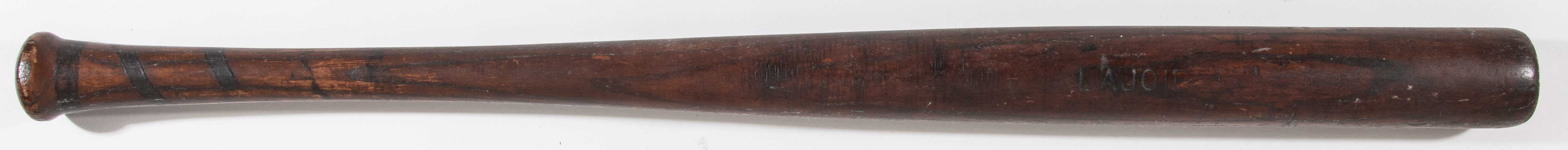 Description:Napoleon Lajoie model baseball bat c.1905. Early hand turned bat has "LAJOIE" block lettered into the barrel. The font size and style is consistent with bats manufactured by Wright & Ditson in the period. Displays well with scattered use and surface wear and it appears that the barrel end has been cut down reducing length. Includes LOA from PSA/DNA (confirming "retail model"): EX