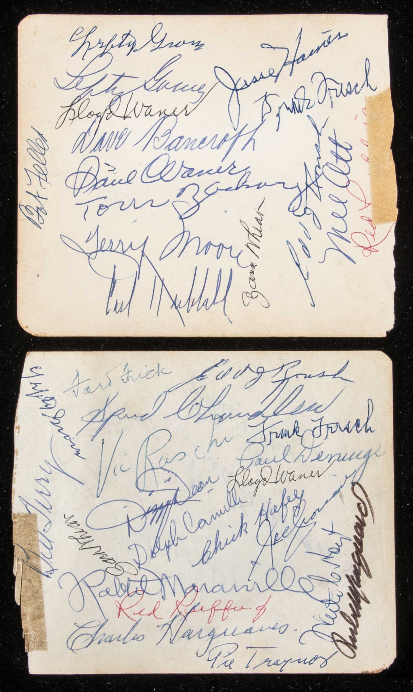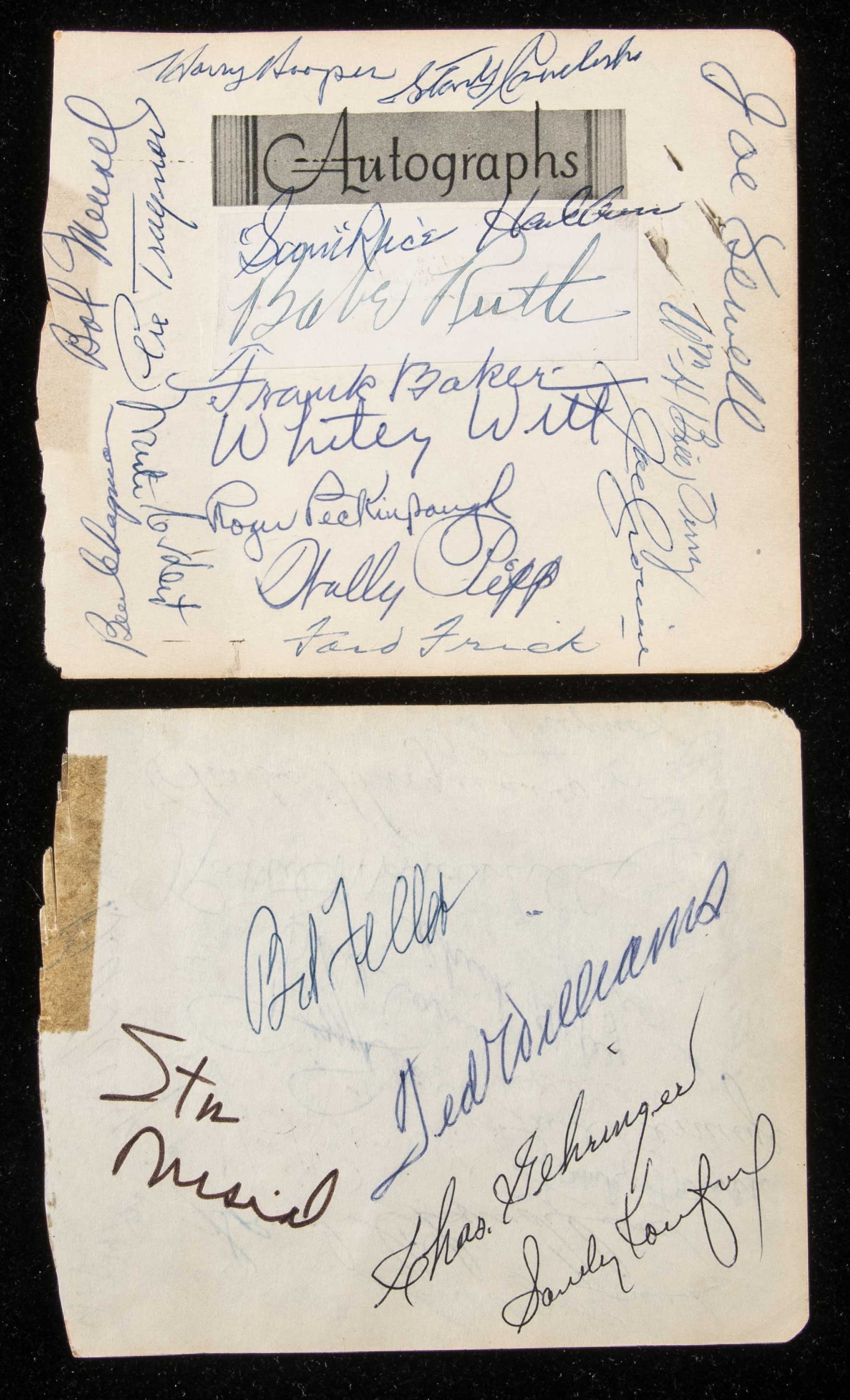 Description:Babe Ruth and others autographed album pages - Impressive assortment of (57) total signatures with (33) different Hall of Famers. Pair of autograph album pages (approx. 4.5"x5.5") hosting a total of (57) signatures including (33) different Hall of Famers. A pair letters which were written to our consignor by the seller (likely in the late 1970s or early 80s) relay that the sheets originated from the first Old-Timers Day at Yankee Stadium in 1947 and he subsequently brought them to Cooperstown each year to keep adding notable player signatures. Together they represent an impressive collection with (57) total signatures with (45) being from Hall of Famers (33 different among them). The first sheet has (32) signatures on front and back including Babe Ruth (cut signature affixed to sheet), Frank Baker, Mel Ott, Harry Hooper, Stan Coveleski, Pie Traynor, Waite Hoyt, Sam Rice, Hank Aaron, Wally Pipp, Ford Frick, Roger Peckinpaugh, Joe Sewell, Bill Terry, Joe Cronin, Bob Feller, Lefty Grove, Lefty Gomez, Lloyd Waner, Dave Bancroft, Paul Waner, Carl Hubbell, Tom Zachary, Zach Wheat, Jesse Haines, Frank Frisch, Edd Rough, and Red Ruffing who is partially obscured. The second page bears a total of (25) signatures incl. Ted Williams, Sandy Koufax, Stan Musial, Charles Gehringer, Bob Feller, Lefty Grove, Dizzy Dean, Bill Terry, Edd Rough, Ford Frick, Rabbit Maranville, Red Ruffing, Pie Traynor, Frank Frisch, Chick Hafey, Joe Cronin, Waite Hoyt, and Rube Marquard. Signatures rate 7 to 9 out of 10 (one or two lesser) and there is a touch of light toning/wear to pages. Includes letter of provenance and full LOA from JSA: EX-NM