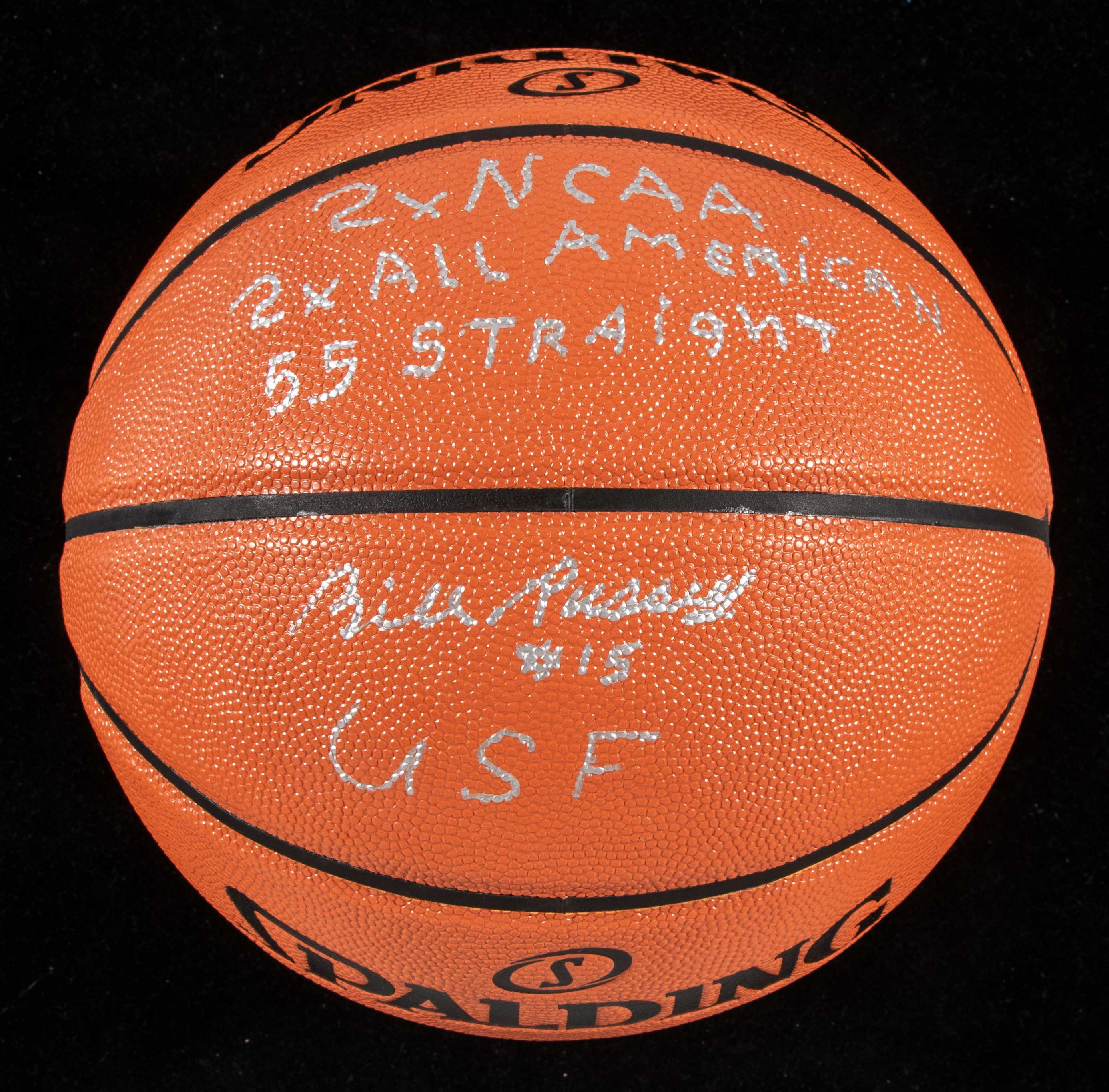 Description:Bill Russell autographed and statistically inscribed basketball. Official Spalding NBA basketball signed by Russell in silver adding uniform #15 from his University of San Francisco tenure. Russell has added additional desirable inscriptions, "2XNCAA, 2X All American, 55 Straight, and USF". Uncommonly seen Bill Russell statistically inscribed ball with direct Russell Collection provenance. Includes auction LOA from JSA with Legends Unite hologram affixed and certificate of provenance from Bill Russell: NM-MT