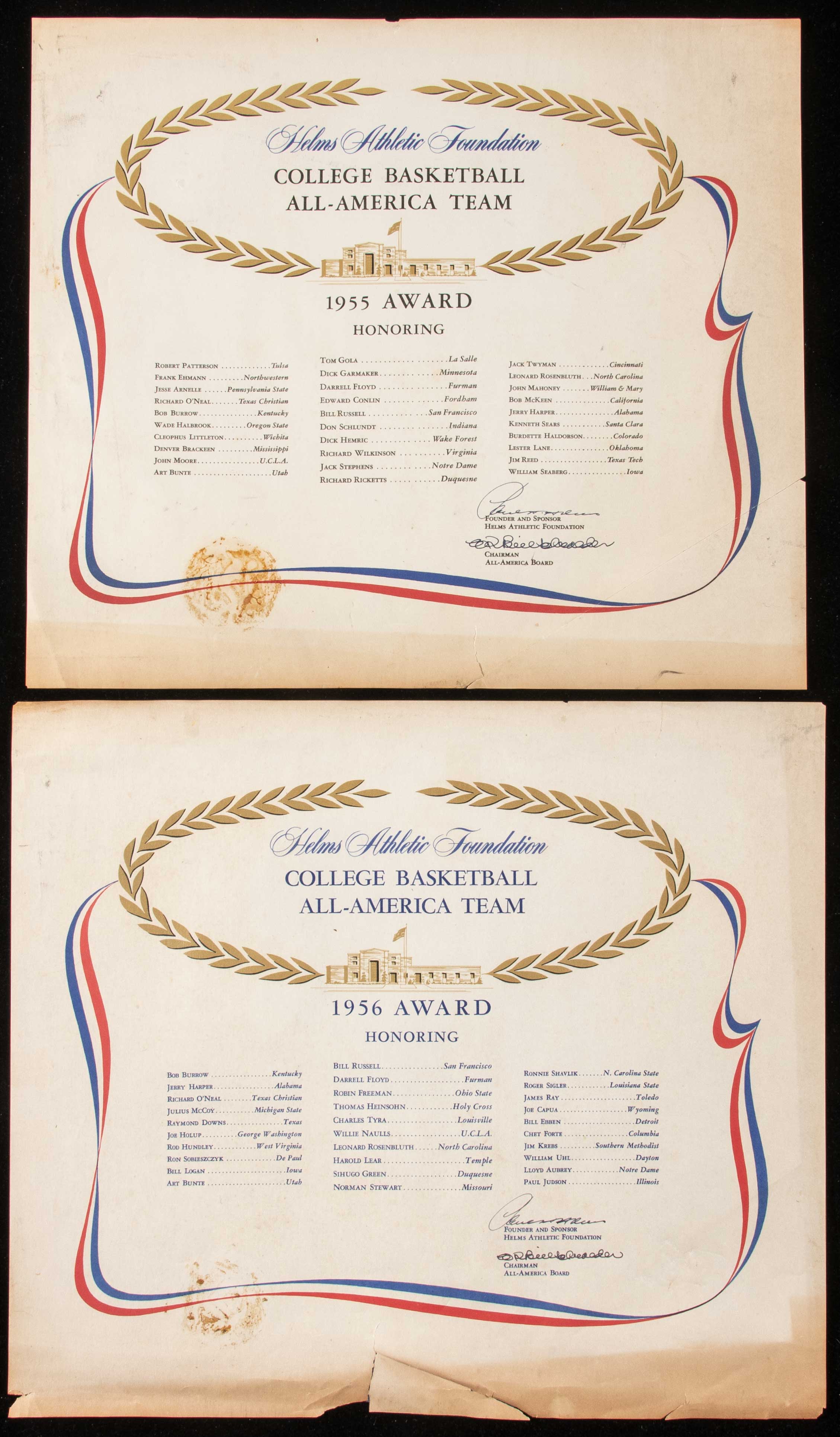 Description:1955 and 1956 Bill Russell Helms Athletic Foundation presentational awards. Pair of original certificates of award as presented to Russell for the 1955 and 1956 seasons in recognition of being named to the respective All-American teams for the University of San Francisco. Each parchment paper certificate has varying degrees of general wear including tears, border chipping, some tape reinforcement to the back, and missing gold seals at bottom left. Fine pair of original awards relating to Russell's iconic NCAA championship seasons. Includes (2) individual certificates of provenance from Bill Russell: Range PR-VG/EX