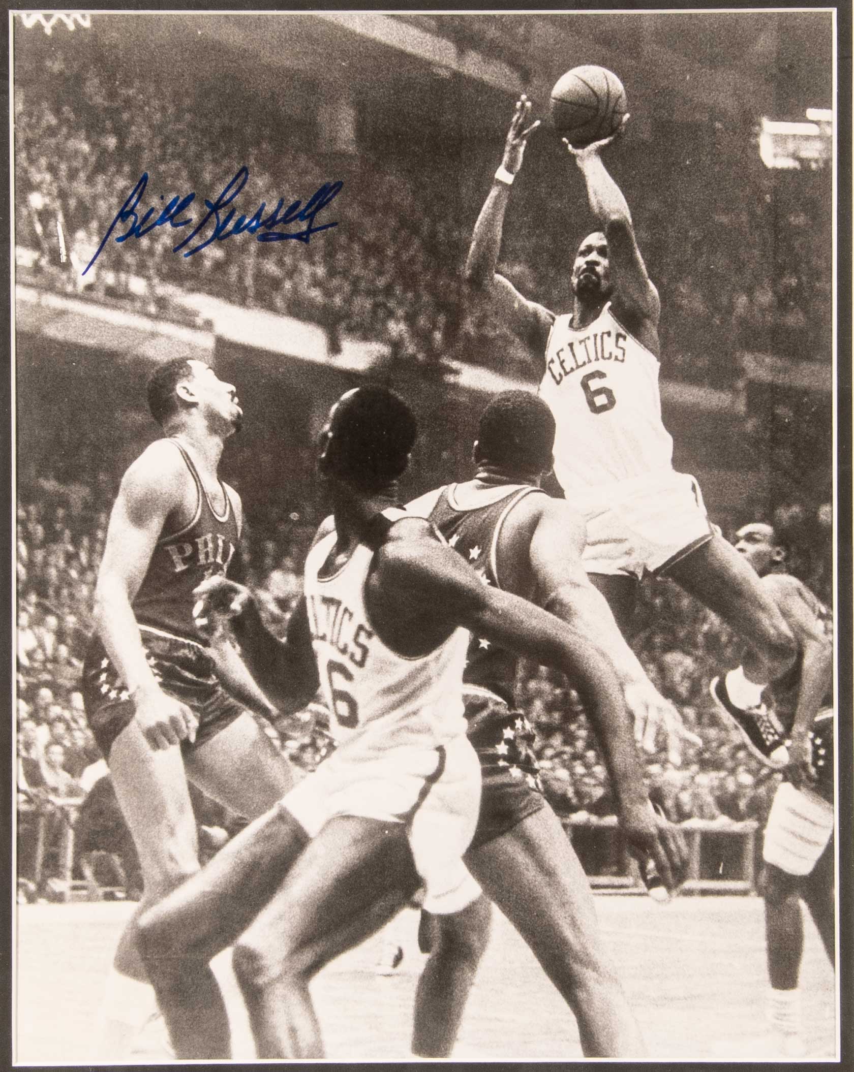 Description:Bill Russell autographed photograph. Matted and framed 11"x14" black and white image as displayed in the Russell home. Photo shows Russell leaping to make a basket over Wilt Chamberlain and the Philadelphia 76ers. Signed by Russell in blue sharpie at top left. Includes auction LOA from JSA and certificate of provenance from Bill Russell: NM