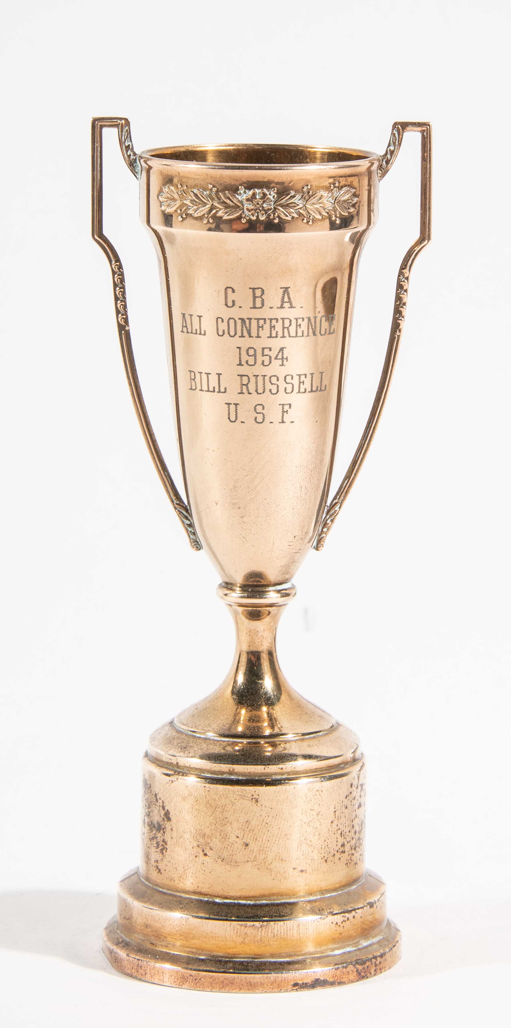 Description:1954 Bill Russell C.B.A. All Conference trophy. Diminutive metal trophy cup (6" tall) is engraved "C.B.A. All Conference 1954, Bill Russell U.S.F." on the front. A desirable early piece awarded to Russell who was then refining the skills and manner of play which he would bring to the NBA. Touch of light handling wear. Includes certificate of provenance from Bill Russell: EX/MT