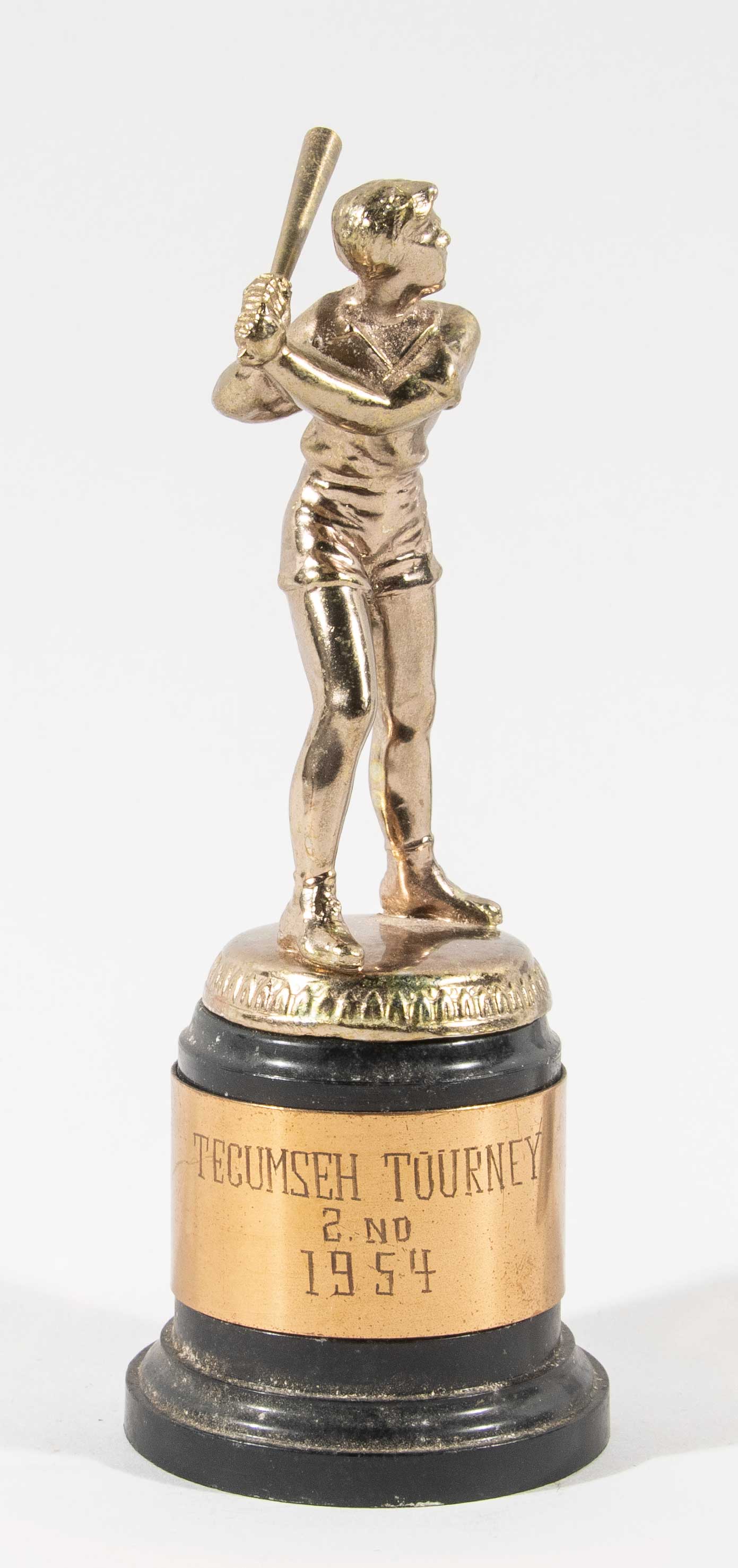 Description:1954 "Tecumseh Tourney" trophy from the Russell Collection. Small trophy (approx. 6" tall) has a figural baseball player/batter standing atop base with engraved metal plate reading "Tecumseh Tourney, 2nd, 1954." Among the earliest presentational pieces in the Russell Collection and would date from when he was around (20) years old. Touch of light wear. Includes certificate of provenance from Bill Russell: EX
