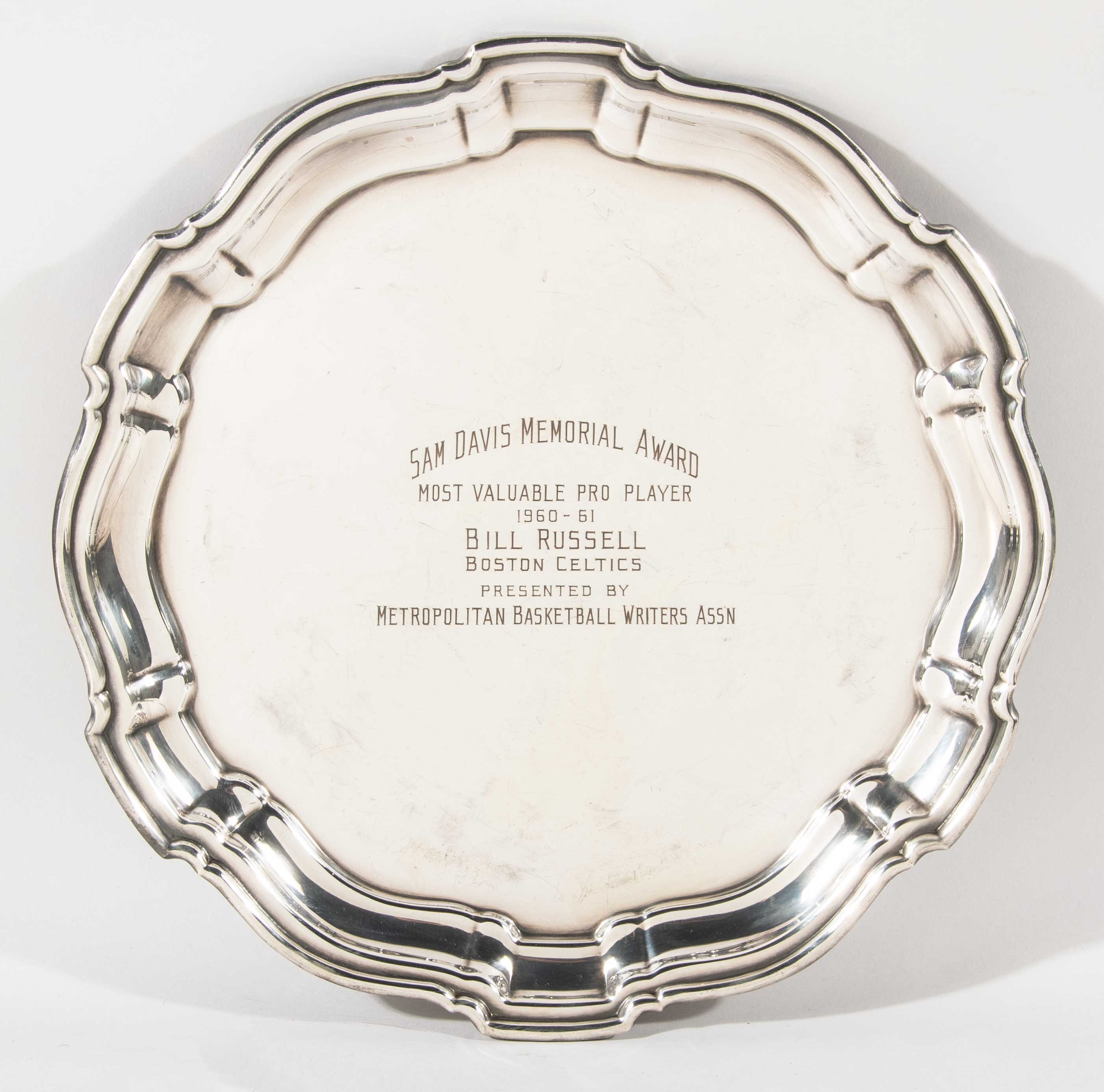 Description:1960-61 Bill Russell "Sam Davis Memorial Award: Most Valuable Pro Player" (MVP Season). Prestigious award as presented to the outstanding professional basketball player of the year by the Metropolitan Basketball Writers Association. Inscribed on the front, "Sam Davis Memorial Award Most Valuable Pro Player 1960-61 Bill Russell Boston Celtics Presented by Metropolitan Basketball Writers Assn". 14" diameter stamped by Poole on the back with typical light to moderate surface wear. One of multiple Most Valuable Player accolades of significance as awarded to Russell for one of the finest seasons of his career. Includes signed letter of provenance from Bill Russell: EX-MT