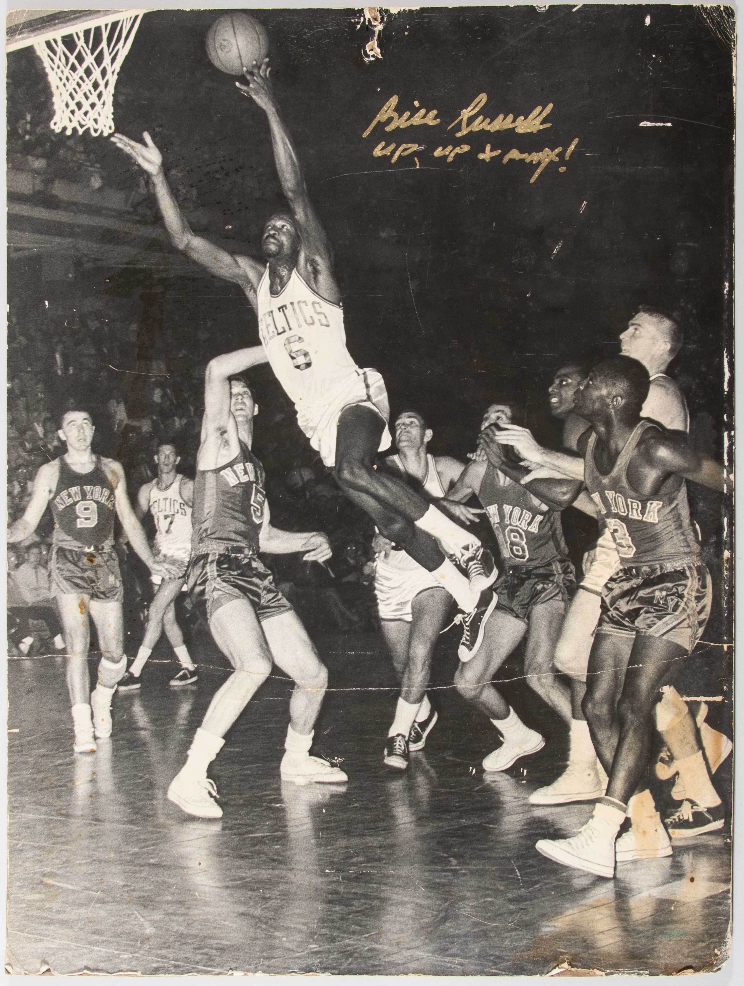 Description:Bill Russell autographed and inscribed large format photographic display by Fred Kaplan c.1960s. Unique large format 18"x24" original image taken by noted sports photographer Fred Kaplan capturing Russell leaping towards the basket to score against the New York Knicks. Image quality for its size is particularly fine with the image having been mounted on board. Signed and uniquely inscribed at top in gold paint pen, "Bill Russell up, up, and away!". Photo has some damage to a few areas of the perimeter and a horizontal surface scratch at bottom third. Photographer Fred Kaplan has signed at lower right. Includes auction LOA from JSA and signed letter of provenance from Bill Russell: Photo: VG, Signature: NM