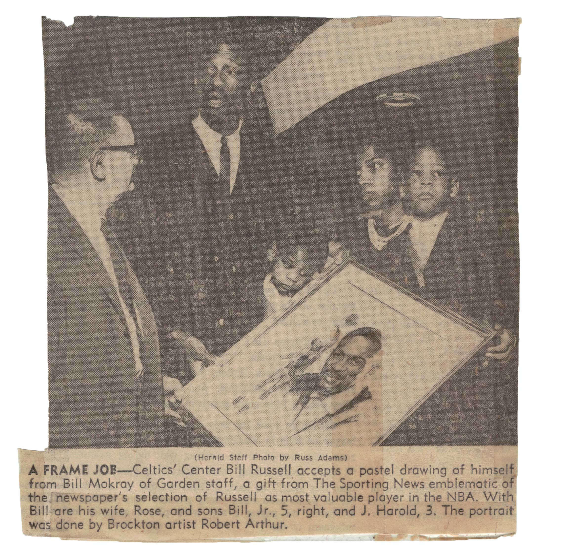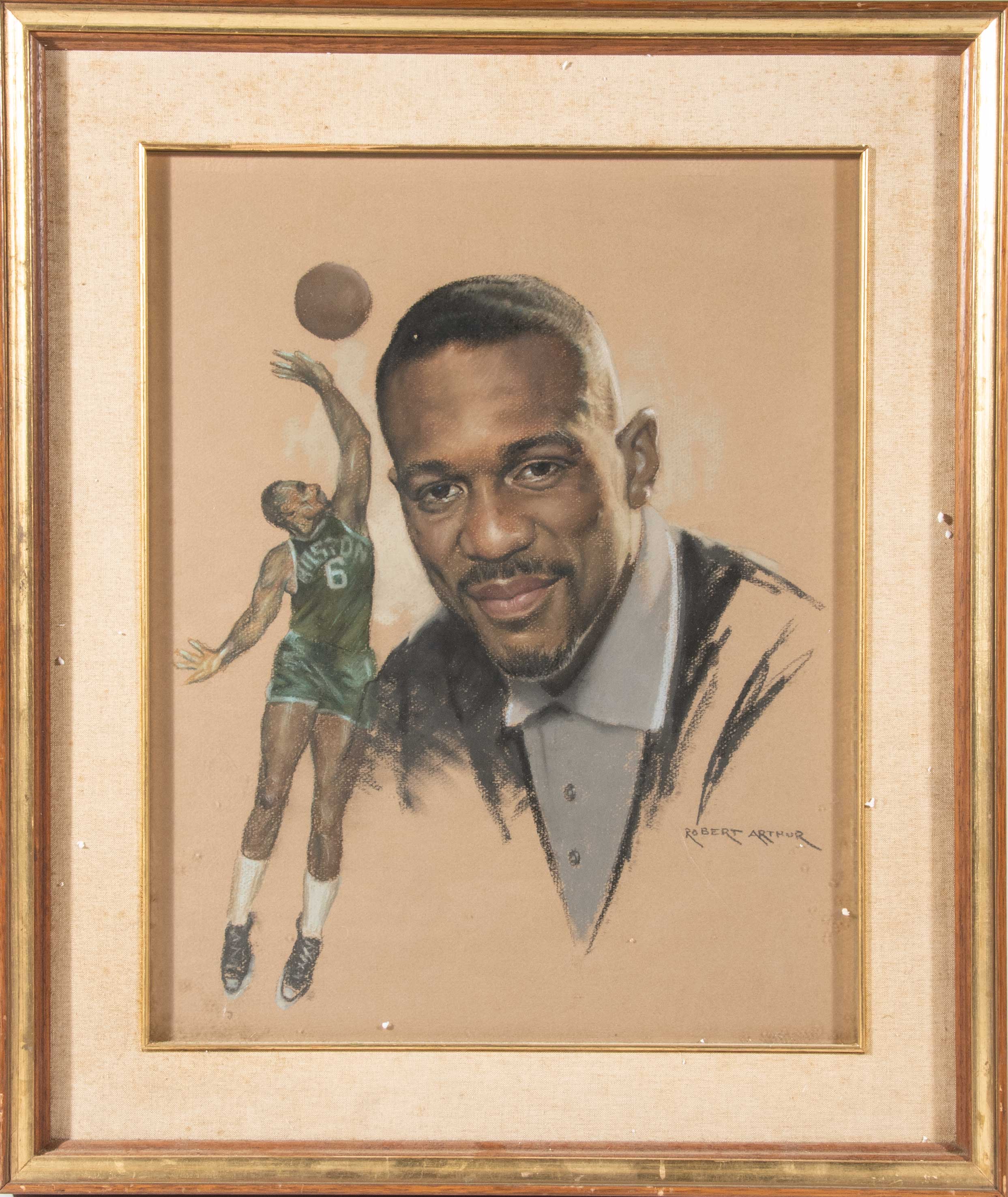 Description:Fine Bill Russell original illustrative painting by Robert Arthur as presented by The Sporting News for the 1962 MVP Award c.1962 (Russell Collection Photo Match). Beautifully executed color pencil on board with watercolor appointments by noted Massachusetts artist, Robert Arthur. Exceptional detail evident particularly in the portrait of a young Bill Russell positioned alongside of an action posed in Celtics uniform. 15"x18" in a double matted gilt frame signed by artist at lower right. Arthur’s works are highly coveted with additional subjects having included Rocky Marciano and Red Auerbach. The offered painting was given to Russell by The Sporting News having been recognized as the NBA Most Valuable Player for 1962 and is accompanied by a period newspaper photo picturing Russell receiving the painting. Includes certificate of provenance from Bill Russell: EX-MT