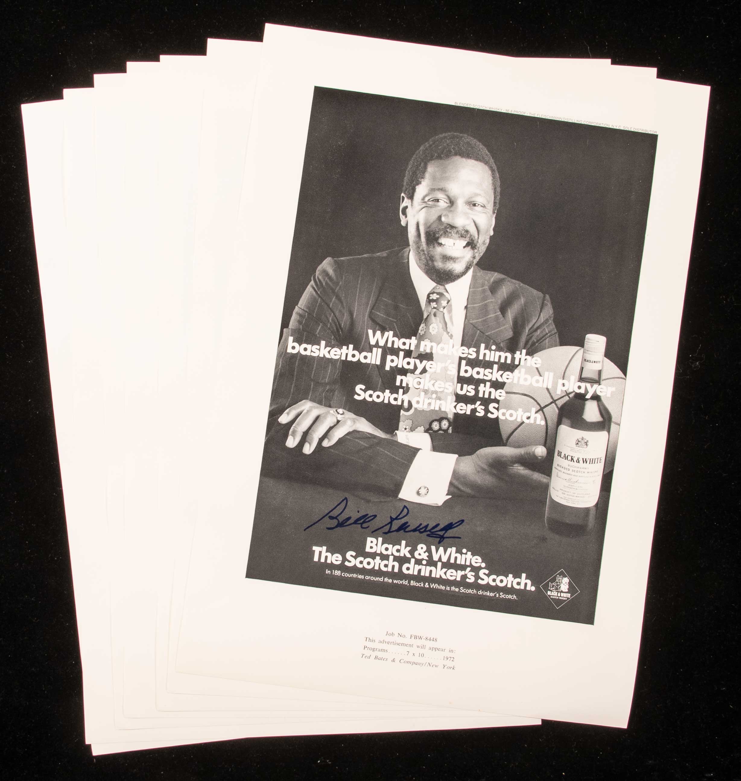 Description:Lot of (7) Bill Russell autographed advertising proof sheets c.1972. Black and white 9"x13" proof sheet for Black and White Scotch depicting Russell smiling and holding basketball. Each has been signed by Russell across the front in either blue or silver sharpie. Ted Bates & Co. promotional proof stampings at bottom margin dated 1972. Includes auction LOA from JSA and seven individual certificates of provenance from Bill Russell: NM