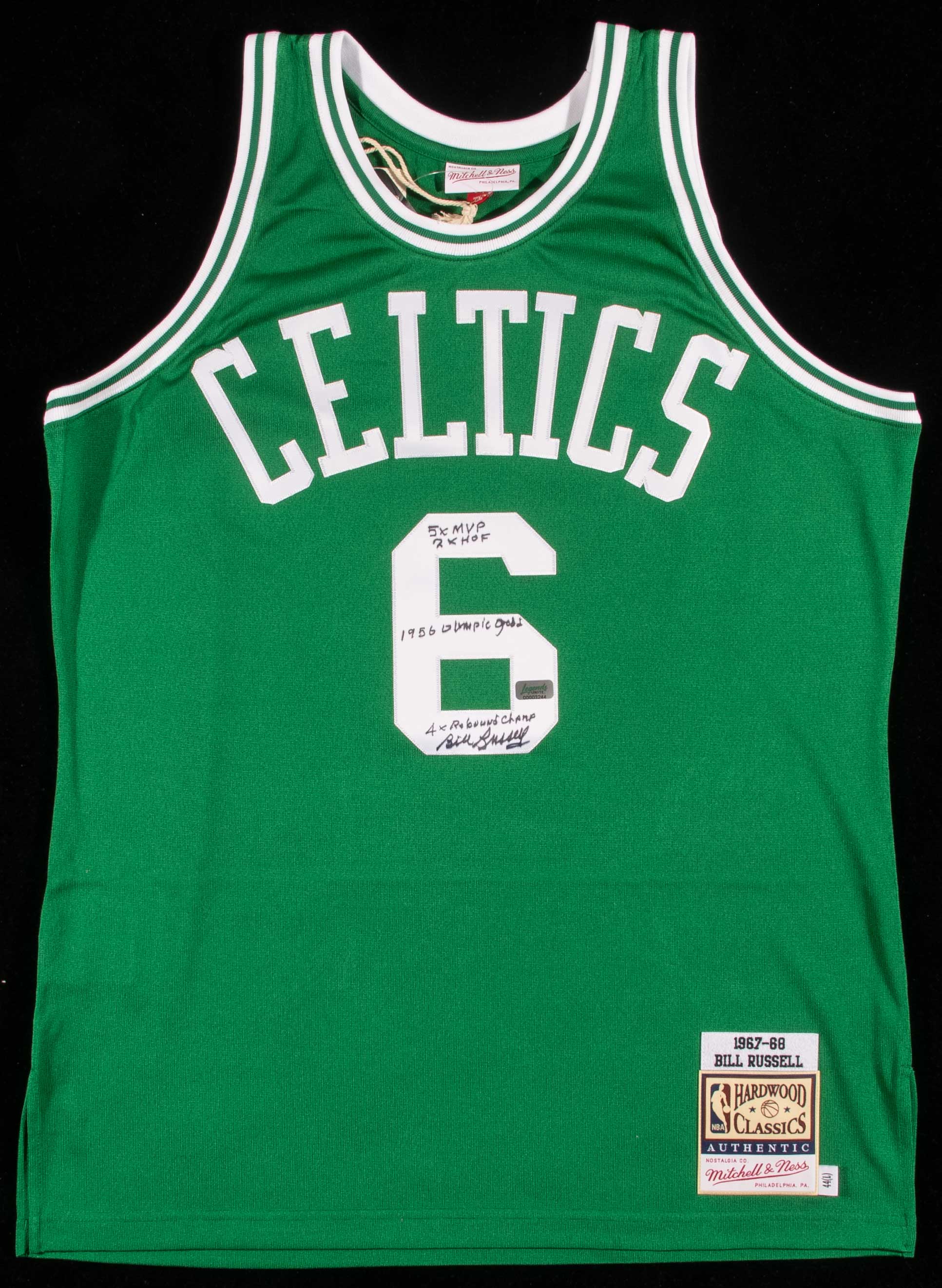 Description:Bill Russell autographed and statistically inscribed Boston Celtics replica jersey by Mitchell & Ness. Top of the line Mitchell & Ness "Hardwood Classics" Boston Celtics 1967-68 style jersey which has been autographed by Russell across the front in black sharpie. Russell has added the highly uncommon career statistical inscriptions, "5XMVP, 2XHOF, 1956 Olympic Gold, 4X Rebound Champ". Signature rates 8 out of 10. Very seldom offered Russell signed jersey with career stat inscriptions. Includes full LOA from JSA with Legends Unite hologram affixed: NM