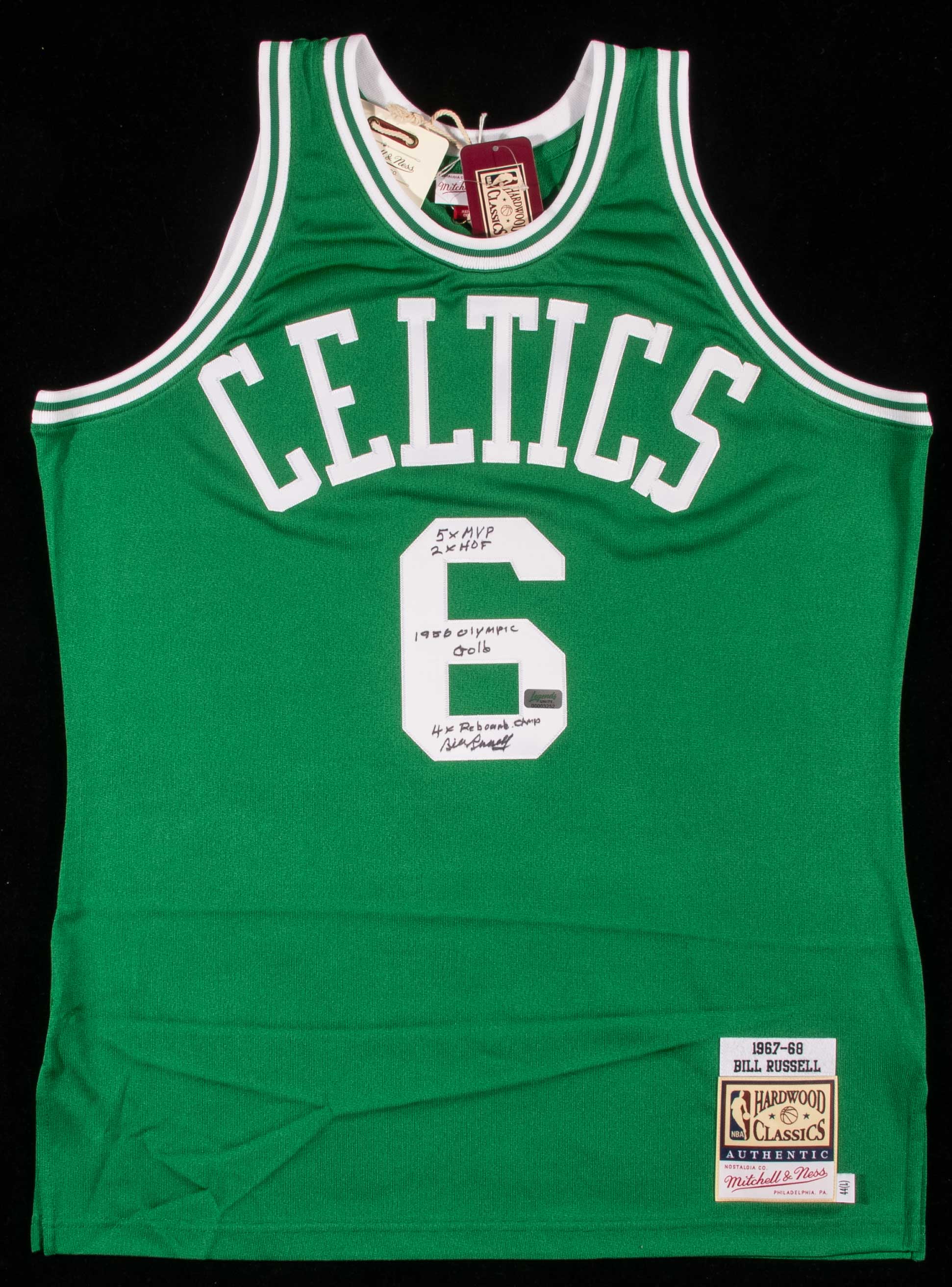 Description:Bill Russell autographed and statistically inscribed Boston Celtics replica jersey by Mitchell & Ness. Top of the line Mitchell & Ness "Hardwood Classics" Boston Celtics 1967-68 style jersey which has been autographed by Russell across the front in black sharpie. Russell has added the highly uncommon career statistical inscriptions, "5XMVP, 2XHOF, 1956 Olympic Gold, 4X Rebound Champ". Signature rates 8 out of 10. Very seldom offered Russell signed jersey with career stat inscriptions. Includes full LOA from JSA with Legends Unite hologram affixed: NM