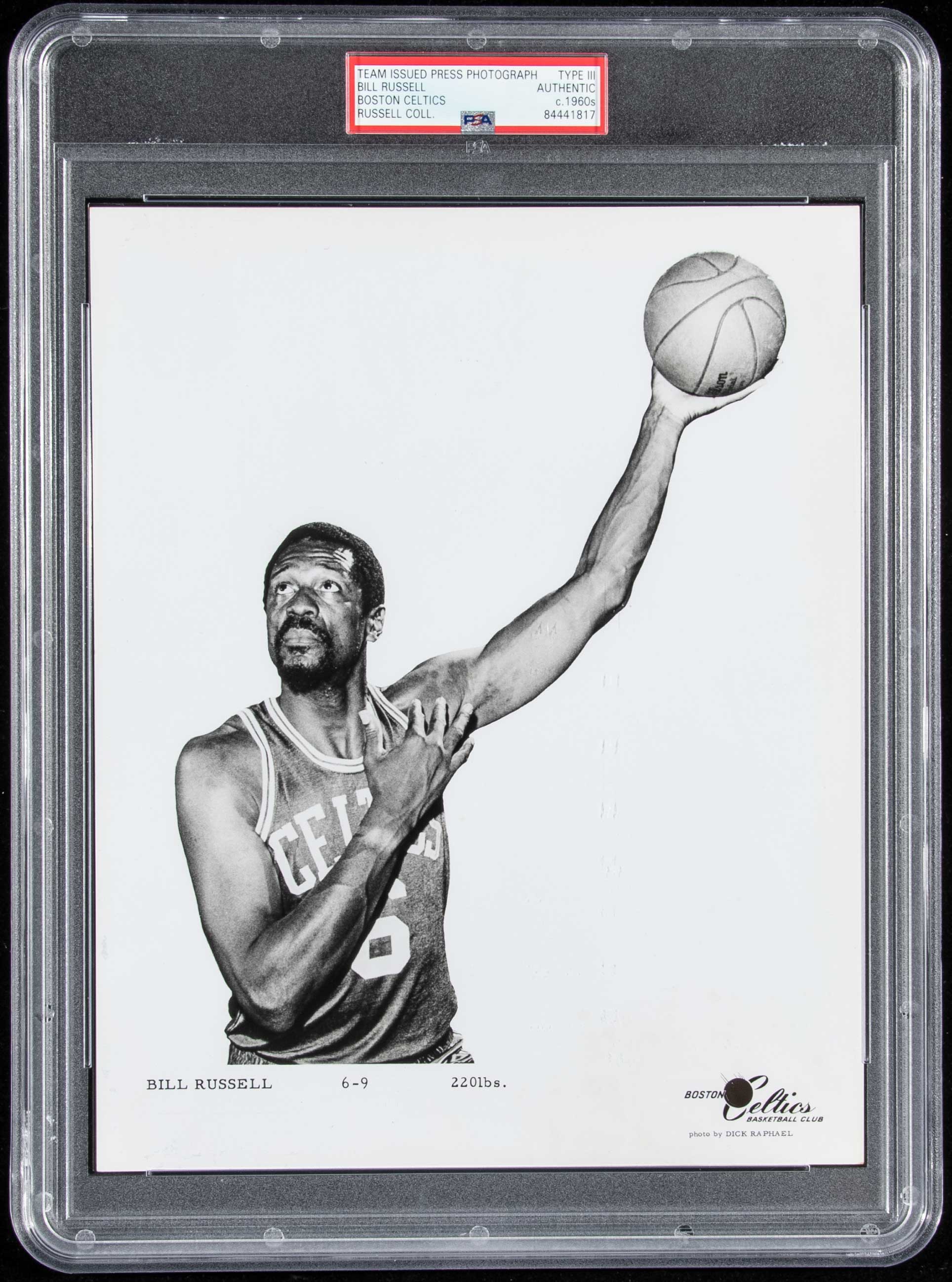 Description:Bill Russell Boston Celtics team issue photograph c.1960s (PSA Type III). Classic black and white 8"x10" image picturing Russell in hook shot pose wearing Celtics green uniform. Printed identification, height, weight, and Celtics insignia at bottom margin. Blank back with a few period notations. Encapsulated by PSA (Type III) having special "Russell Collection" pedigree identification on the labeling with addition full LOA from PSA and certificate of provenance from Bill Russell: NM
