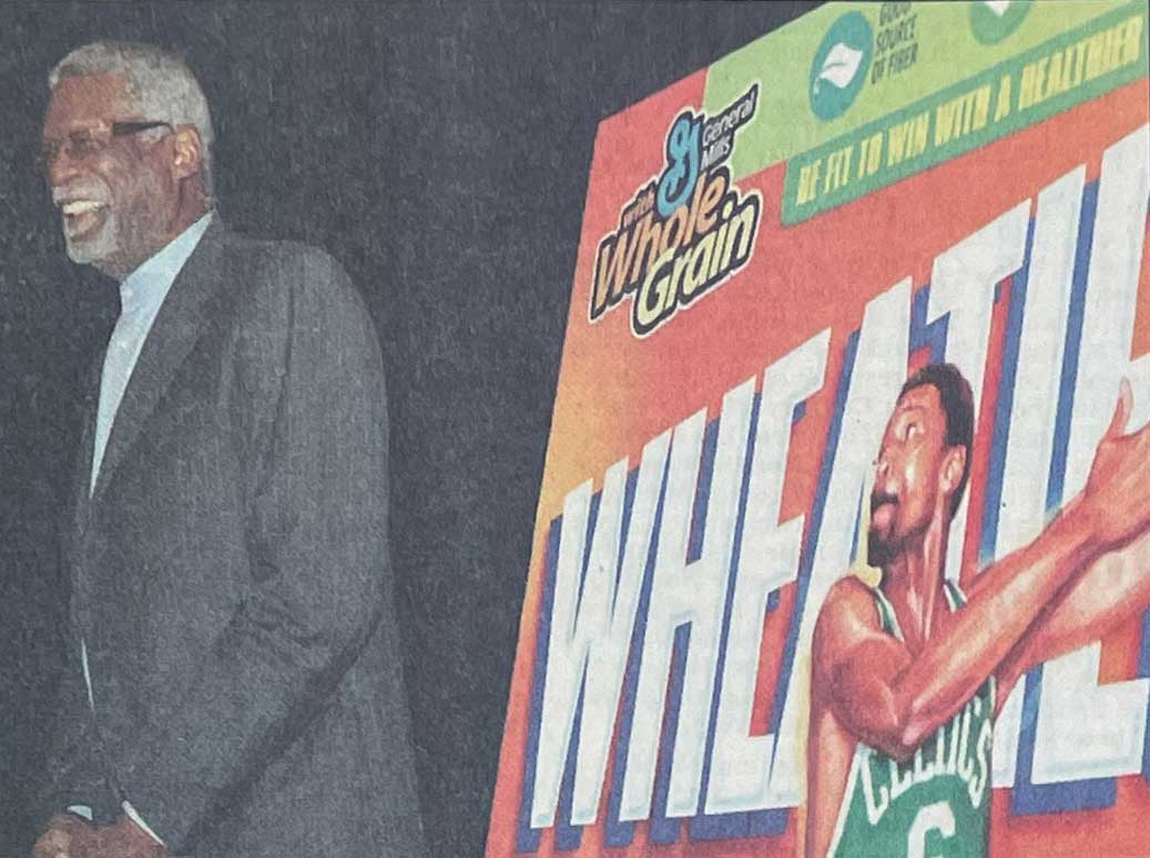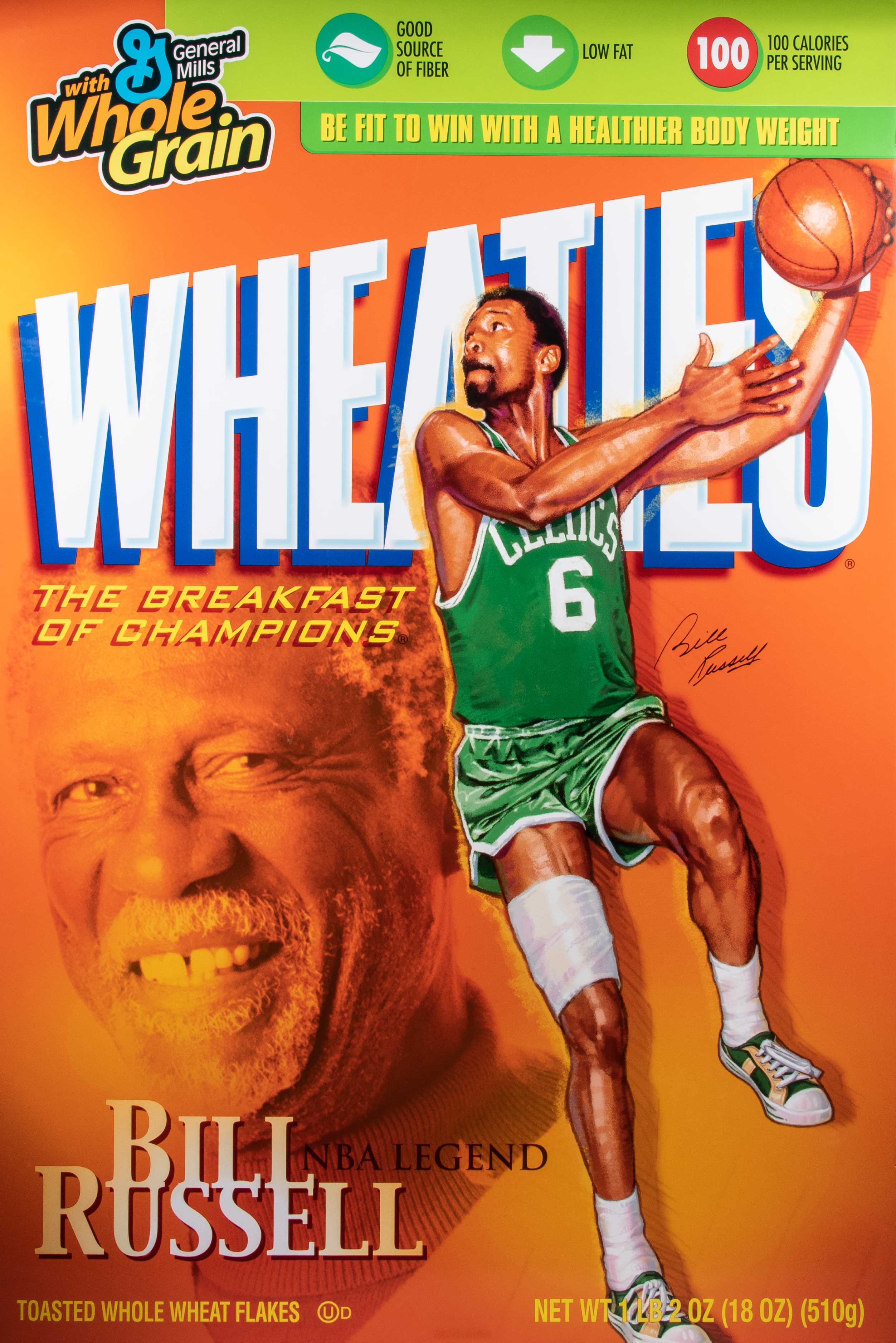 Description:Bill Russell autographed enormous Wheaties box display. Oversized blowup of the front of a Wheaties box has been signed "Bill Russell" in marker rating 9/10 out of 10. The piece was used at press conference announcing his appearance on the box as part of Black History Month in 2007 (he is shown in an included newspaper standing in front of it). Measures 48"x72" with a touch of light edge wear. Includes auction LOA from JSA and certificate of provenance from Bill Russell: EX/MT-NM