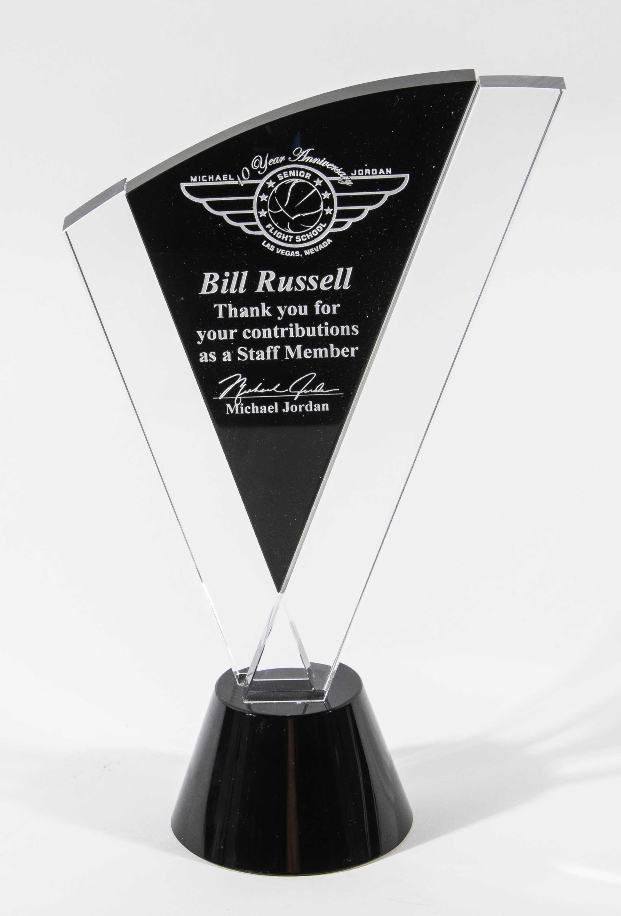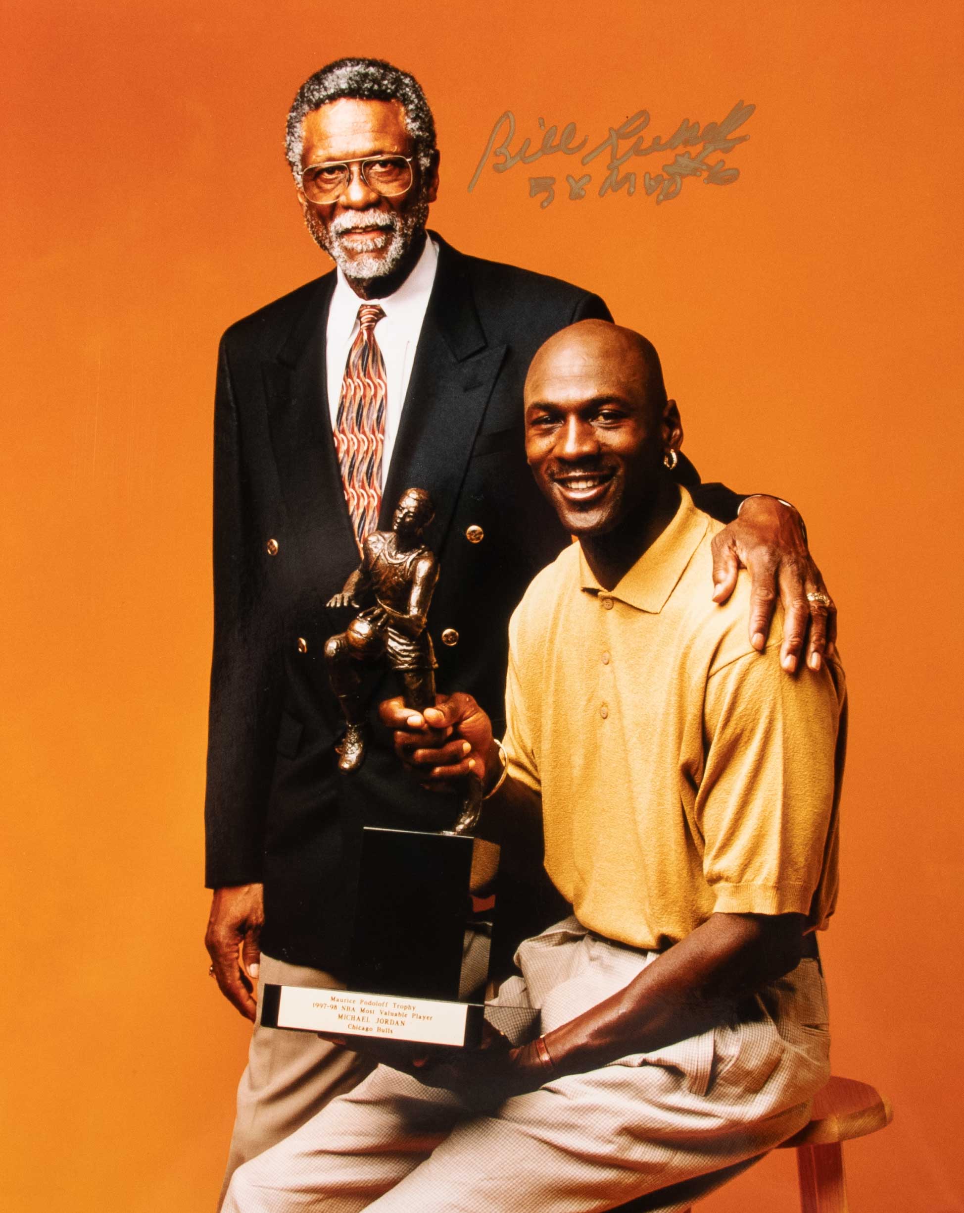 Description:Bill Russell presentational Michael Jordan Flight School award with related autographed photograph. Figural glass and onyx award as presented to Russell by Jordan as a staff member at Senior Flight School on the occasion of it's 10th anniversary. Award stands 12" tall inscribed with facsimile signature of Jordan and retains its original blue velvet hinged lid case. The award is accompanied by 8"x10" photo of both Jordan and Russell which has been signed by Russell in gold adding "5X MVP". includes auction LOA from JSA (signature) and certificate of provenance from Bill Russell: NM