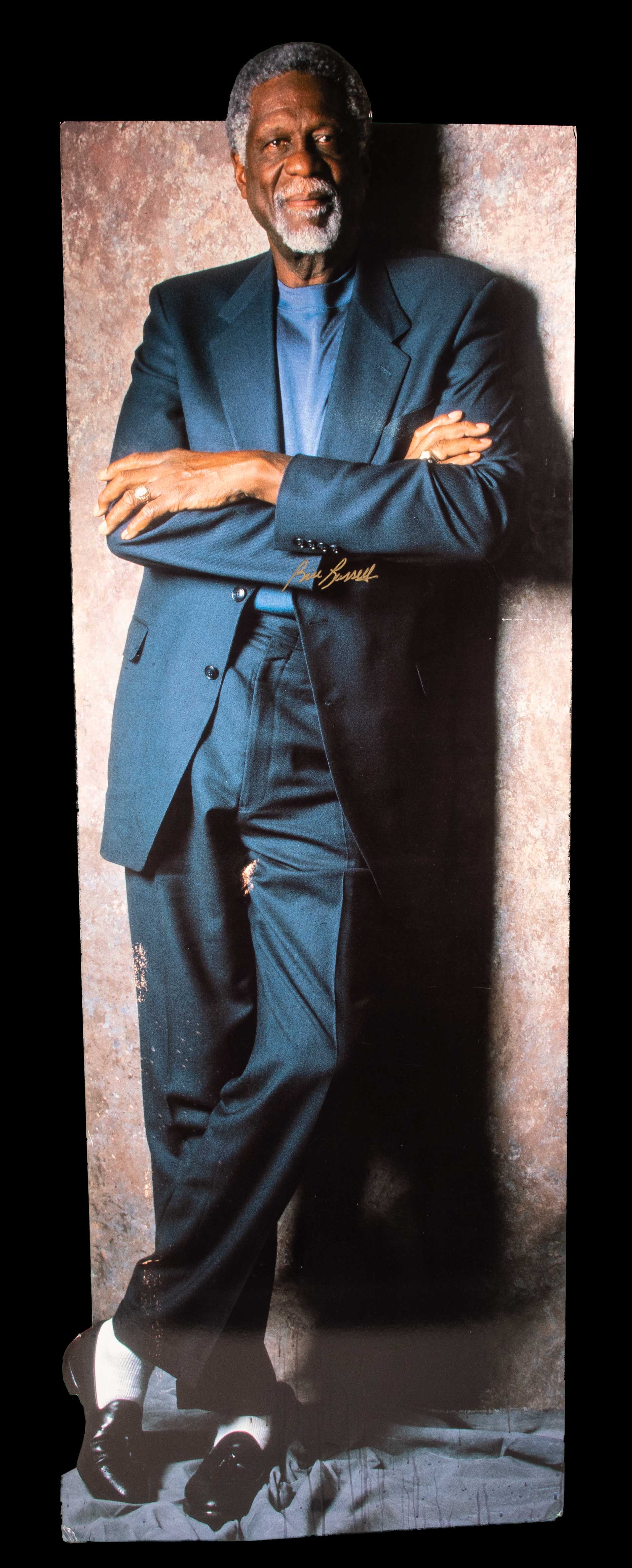 Description:Life size Bill Russell autographed display standee. Color die cut foam board standee as used for promotional purposes depicting Russell posed in street clothes. Signed in gold paint pen across the front. Easel backstand at base has been re-attached. 81" tall. Includes auction LOA from JSA and certificate of provenance from Bill Russell: EX-MT
