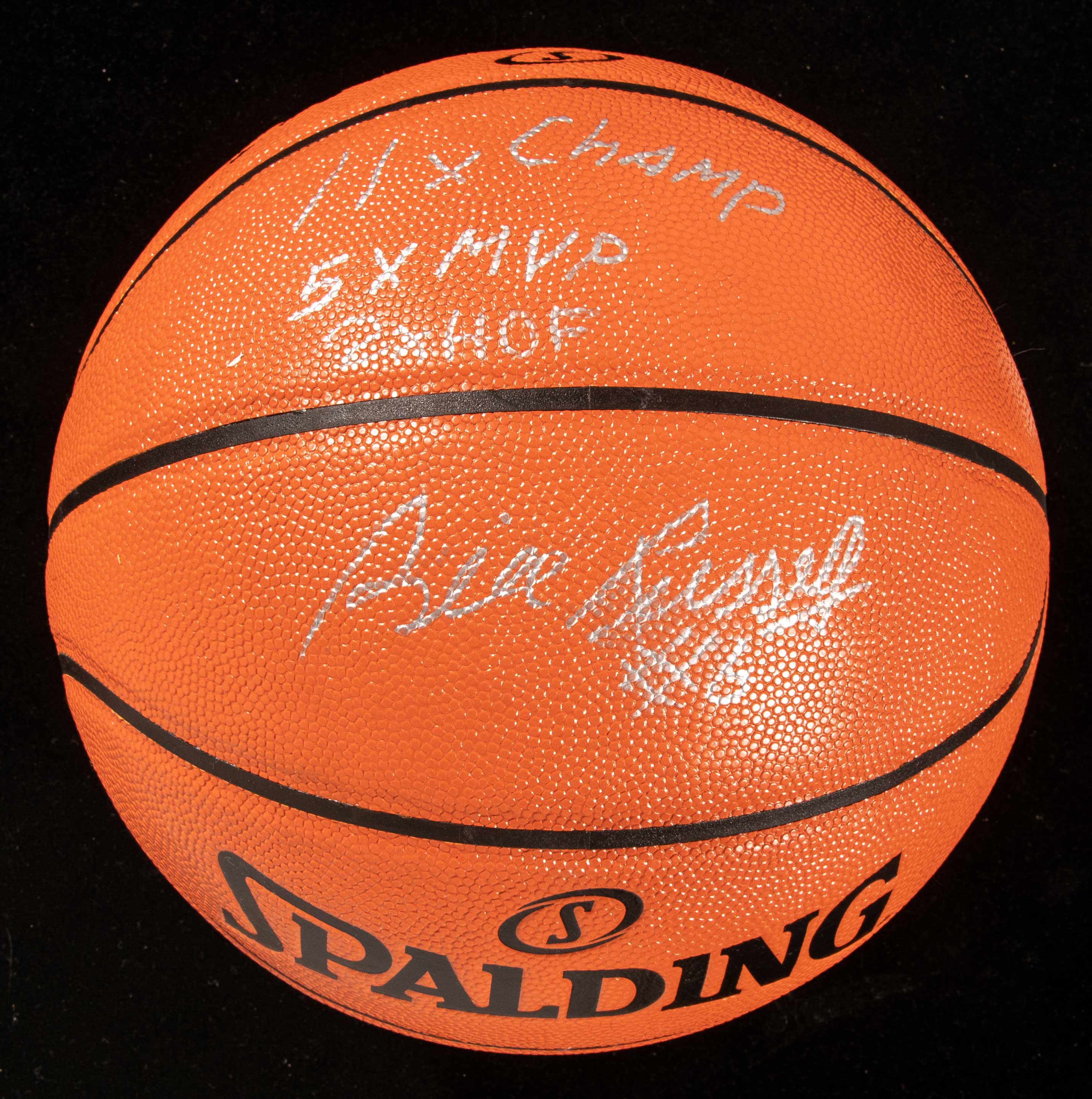 Description:Bill Russell autographed and statistically inscribed basketball. Official Spalding NBA basketball signed by Russell in silver along with additional desirable inscriptions, "#6, 11X Champ, 5X MVP, 2X HOF". Uncommonly seen Bill Russell statistically inscribed ball with direct Russell Collection provenance. Includes auction LOA from JSA with Legends Unite hologram affixed: NM-MT