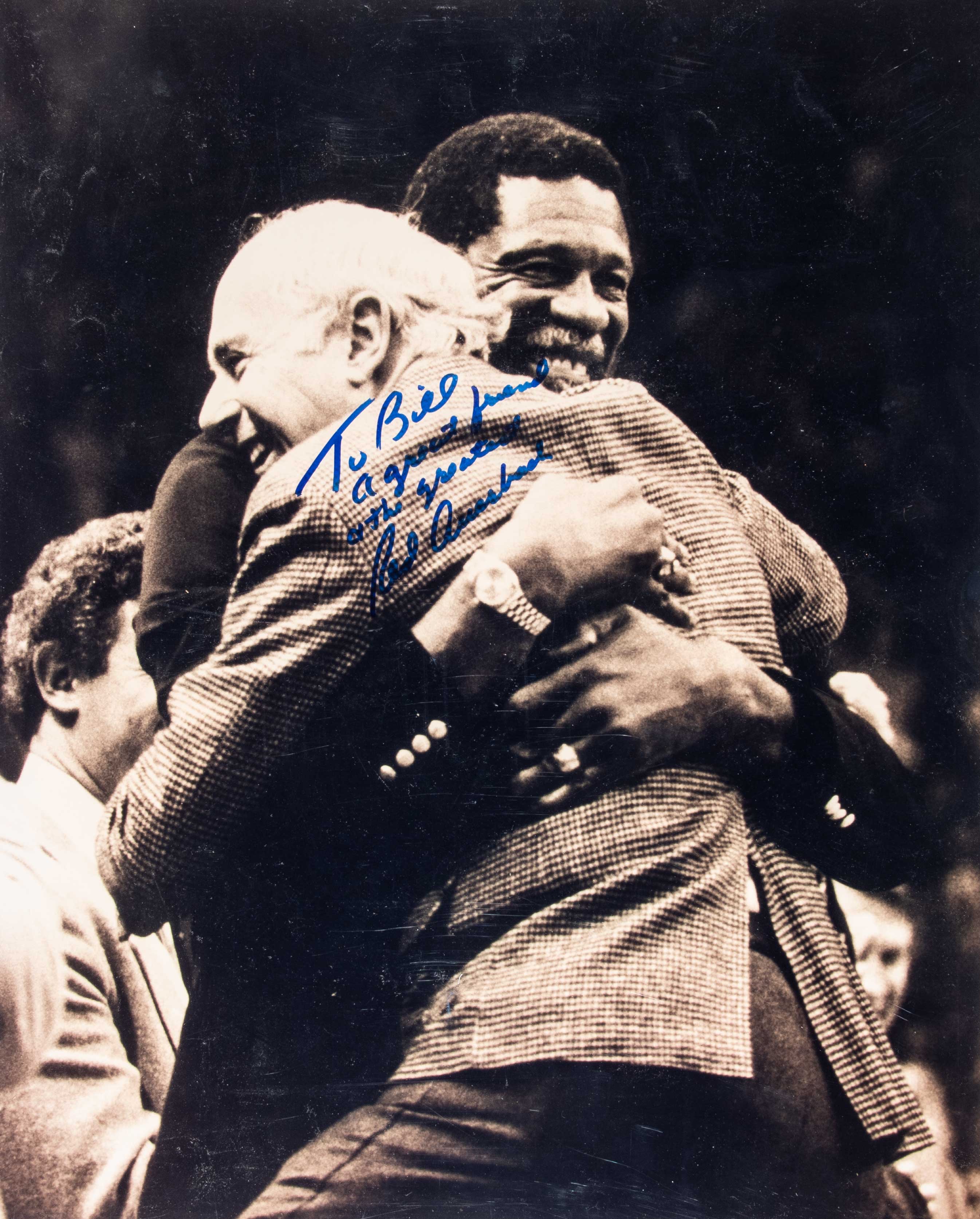 Description:Red Auerbach autographed photograph signed to Bill Russell. Large format 16"x20" sepia tone image signed in blue sharpie, "To Bill, A Great Friend & The Greatest, Red Auerbach". Signature rates 8/9 out of 10. Includes auction LOA from JSA and certificate of provenance from Bill Russell: NM