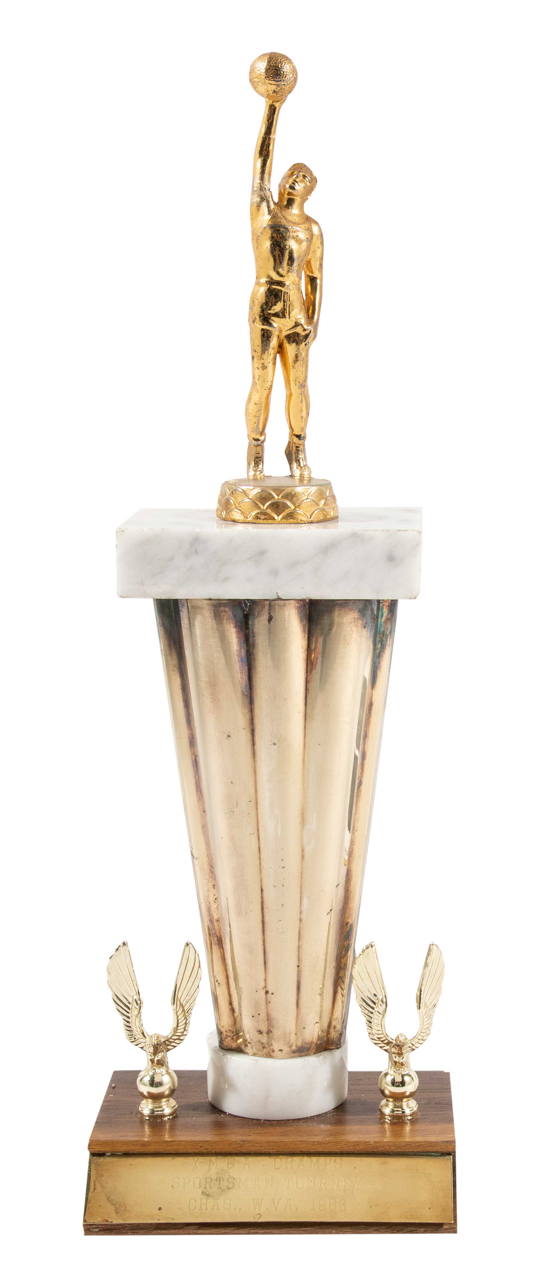 Description:1963 Bill Russell YMCA Tournament trophy. Figural trophy presented to Bill Russell for the 1963 YMCA tournament having figural brass player atop a marble and brass pedestal base. Inscribed brass placard on front, "Y.M.C.A. Champs Sportsman Tourney Chas., W.Va. 1963". Light to moderate surface wear including a bit of tarnishing with repairs at both player figural ankle areas. 14" tall. Includes certificate of provenance from Bill Russell: VG-EX