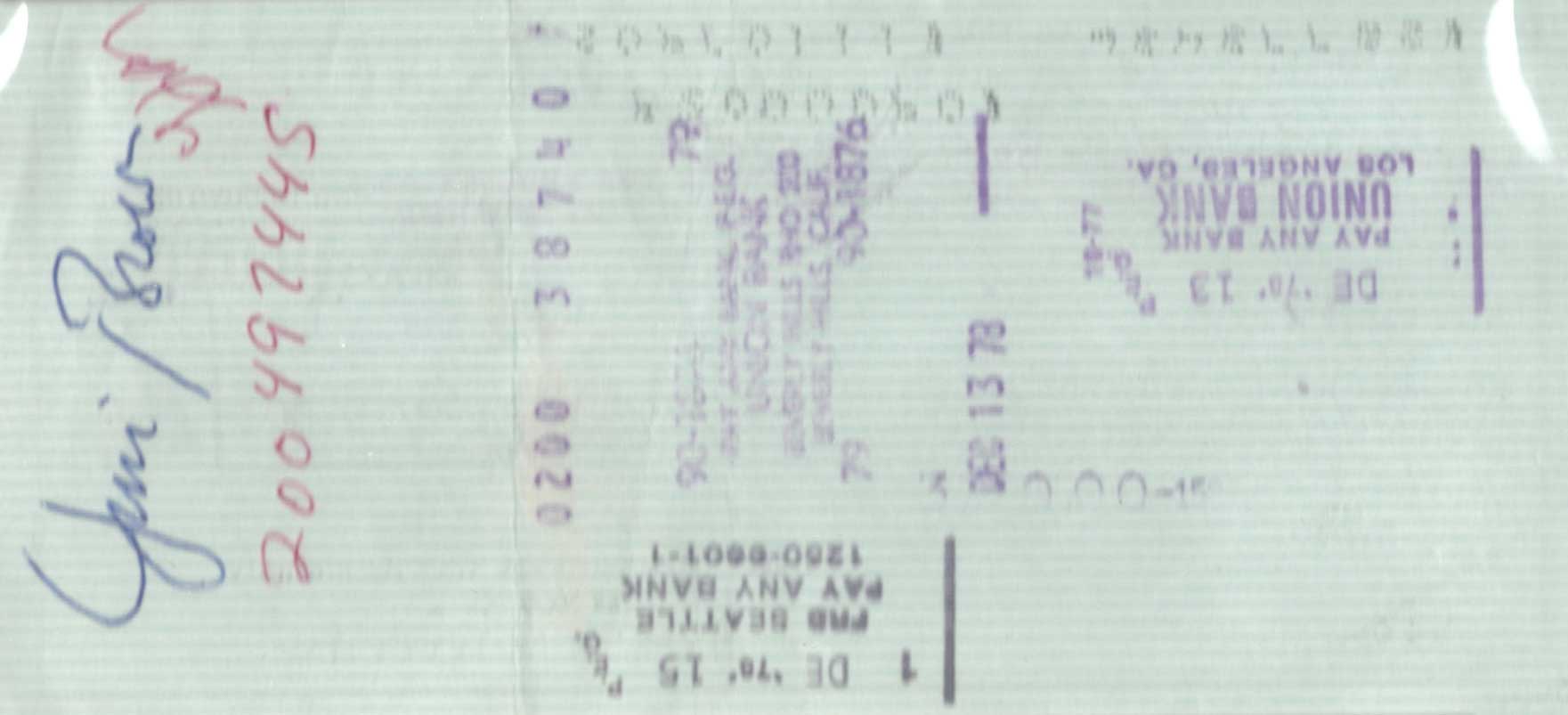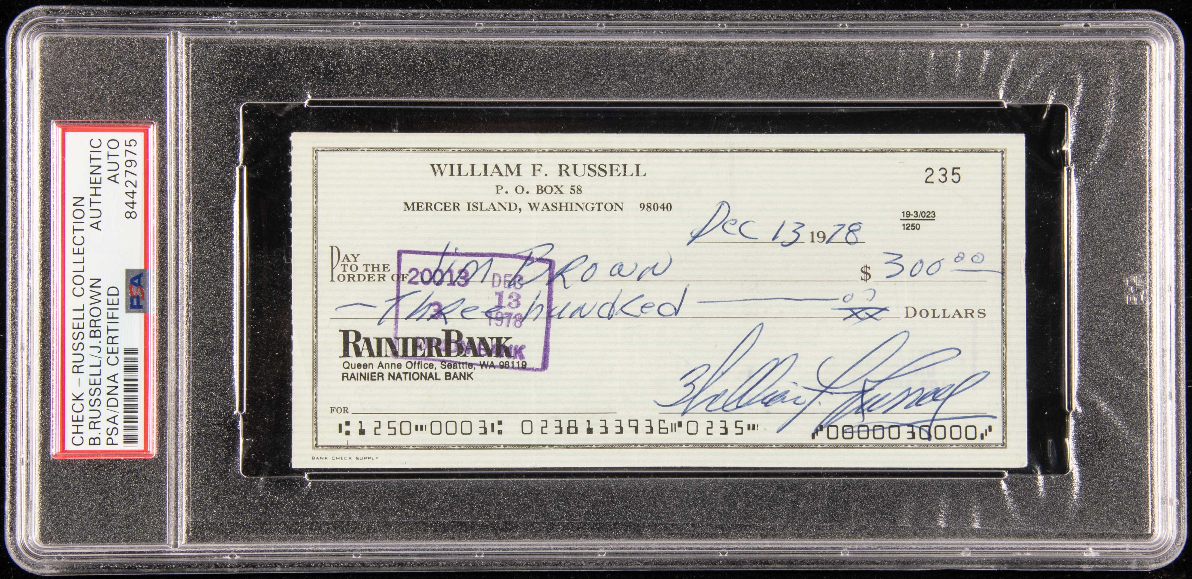 Description:Bill Russell autographed personal check to Jim Brown endorsed by Brown on back (PSA/DNA). Dated December 13, 1978 personal check with Russell name and address printed at top. Check appears to have been printed and endorsed to Brown in Russell's hand although not definitive. Signed at bottom in ink with desirable full name signature, "William F. Russell". The reverse of the check has been hand signed/endorsed, "Jim Brown". Rare check offering which features a combination of two of the most significant athletes of the 20th century. Encapsulated by PSA/DNA with special "Russell Collection" pedigree label and includes certificate of provenance from Bill Russell: NM
