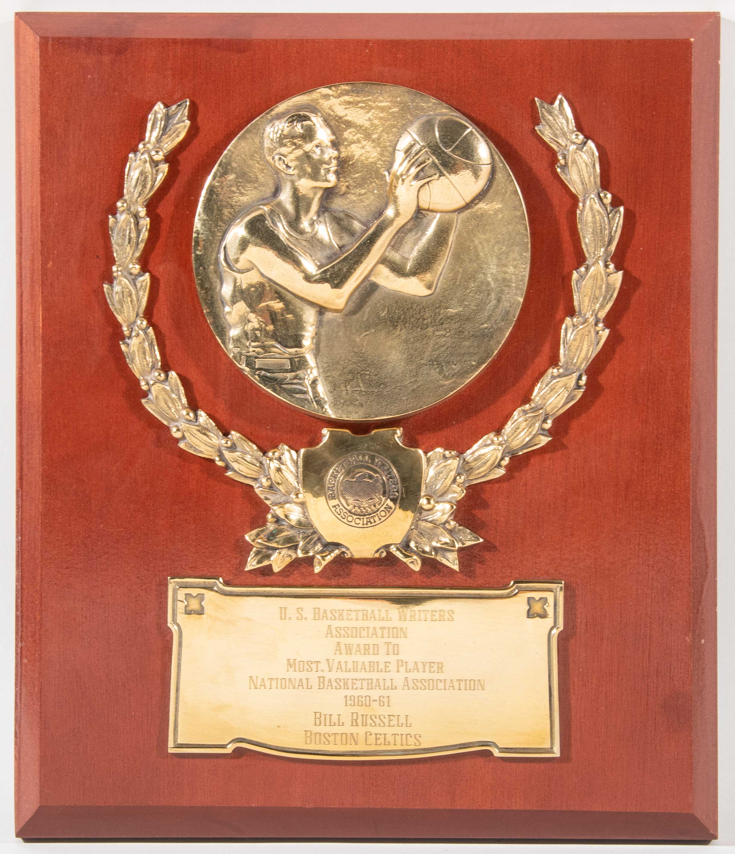 Description:1960-61 Bill Russell U.S. Basketball Writers Association "Most Valuable Player" Award. Significant honor as bestowed upon Russell for his achievements during the 1960-61 season. He would lead the Boston Celtics to their third NBA Championship in (4) seasons. Russell averaged (16.9) points, scoring a total of (1,322), and (23.9) rebounds per game. Wooden placard (10.25"x12") has a basketball player in relief at the top surrounded by figural garland that emanates from an incised "Basketball Writers Association" logo. Below is an engraved metal plate reading "U.S. Basketball Writers Association Award To Most Valuable Player National Basketball Association, 1960-61, Bill Russell, Boston Celtics." In fine overall condition with just a hint of wear to the engraved portion. Includes signed letter of provenance from Bill Russell: EX-EX/MT