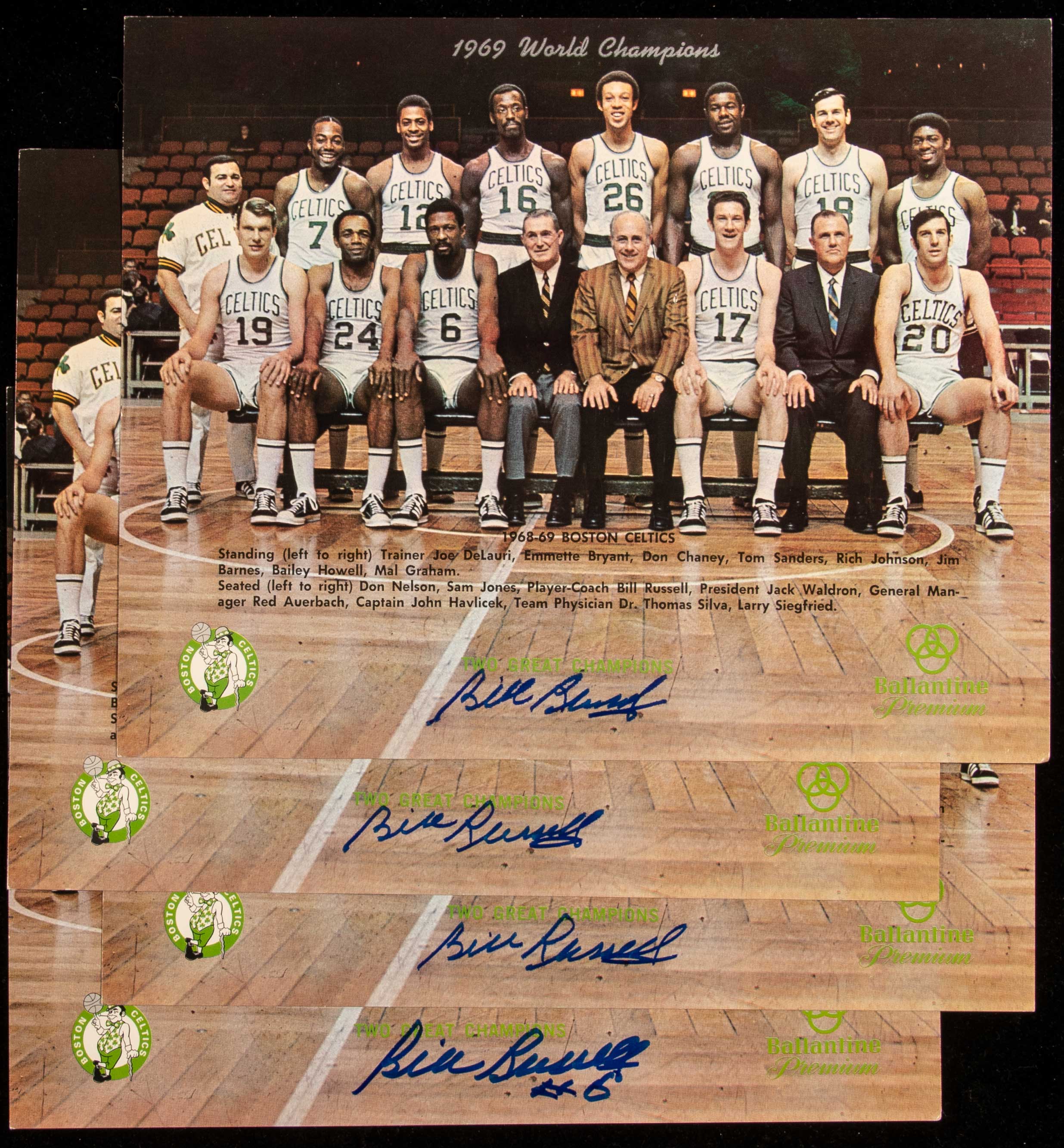 Description:Lot of (4) Bill Russell autographed 1969 Boston Celtics team issue photographs. Vintage 8"x10" color images as distributed by the 1969 World Champion Celtics sponsored by Ballantine Beer Co. (stamped bottom right) each signed by Russell in blue sharpie across the front with one having "#6" notation. Very fine condition with minimal wear. Includes auction LOA from JSA (autographs) and four individual certificates of provenance from Bill Russell: NM
