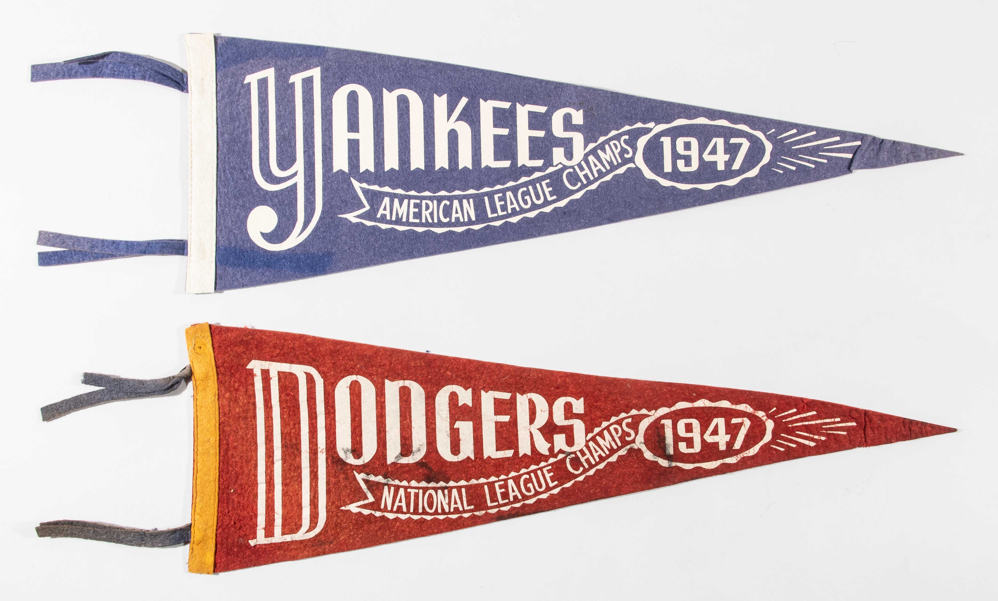 Description:1947 Yankees and Dodgers "Champs" pennants (2). Pair of approx. 22.5" long felt pennants have screened team names along with "1947" and a "Champs" caption from the respective League. Yankees shows some light wear which largely takes the form of a few wrinkles near the pointed end. More pronounced wear to Dodgers pennant which has some soiling/discoloration and a few scattered pin/tack holes: GD/VG and EX-EX/MT
