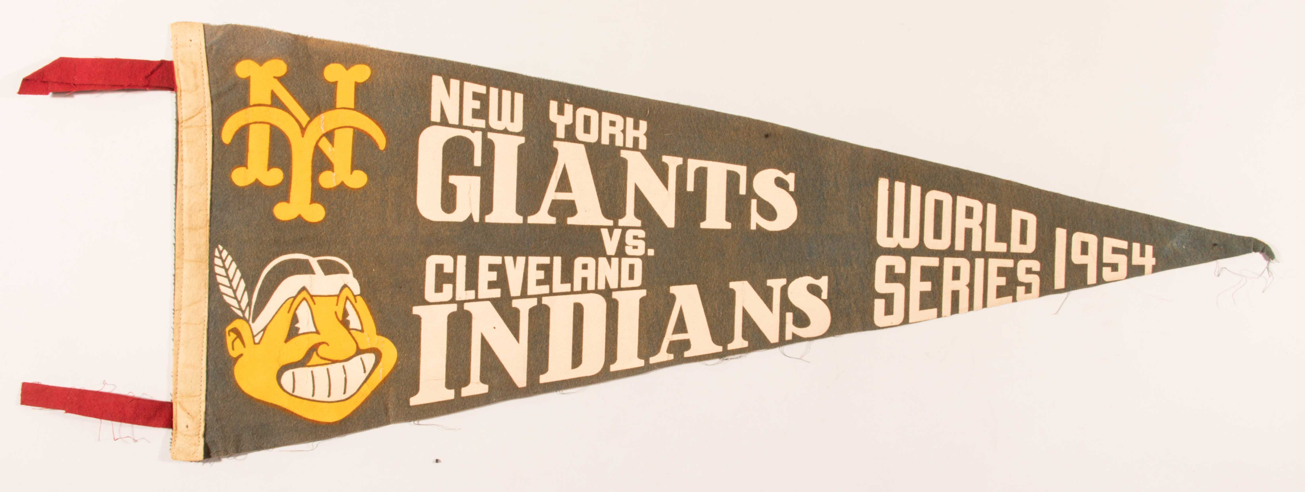 Description:1954 New York Giants vs. Cleveland Indians World Series pennant. Felt pennant (28.5" long) has screened on text/titling and team logo graphics. Fading to color and some mild general wear including some fraying to top and unobtrusive pin/tack holes. Exceedingly rare style: VG