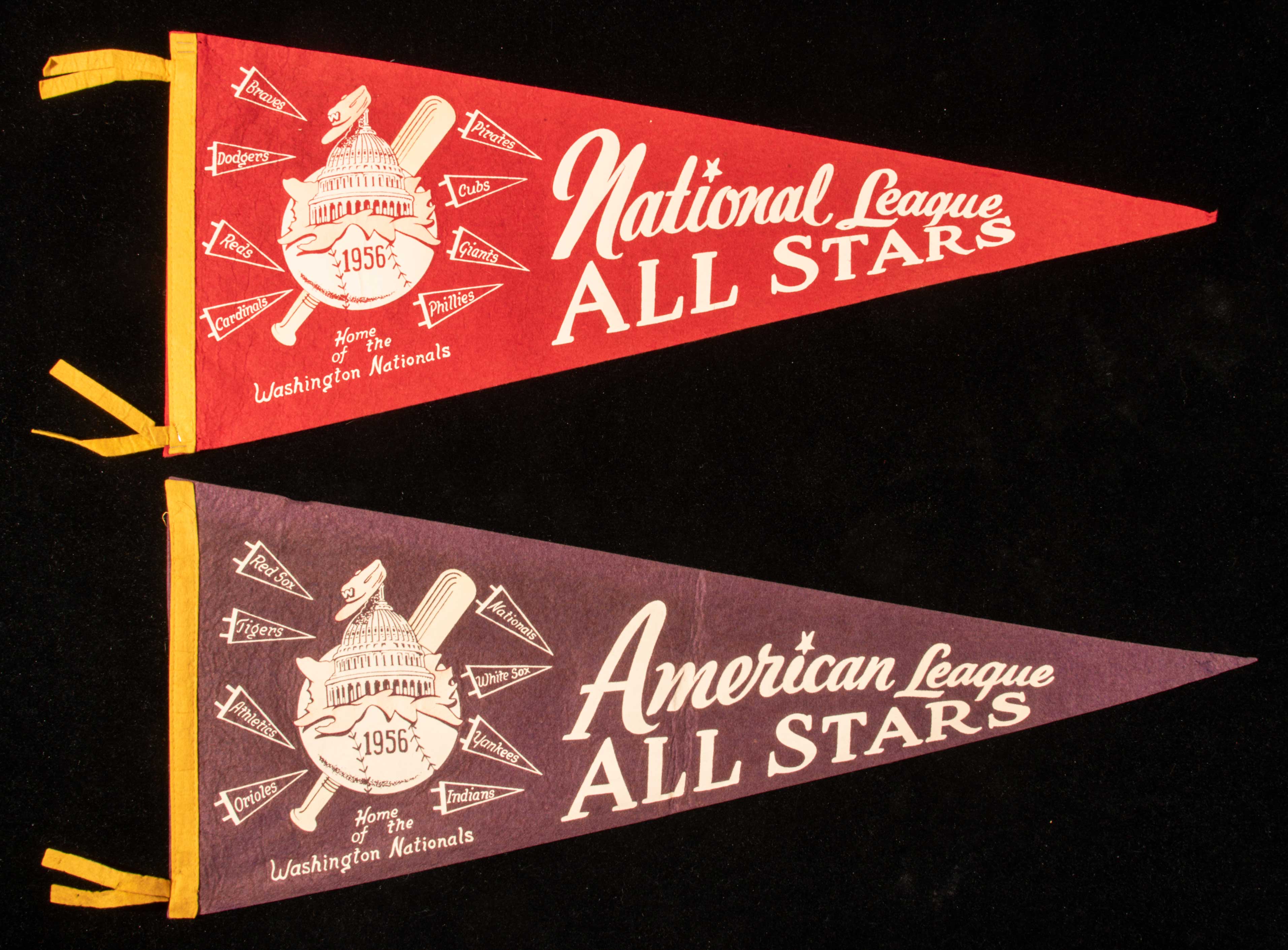 Description:1957 American and National League "All-Stars" pennants (at Washington) (2). Pair of seldom offered felt pennants (approx. 29" long) done to commemorate the game played at Griffith Stadium with the teams in each League listed on left hand portions. Both display nicely however the A.L. is missing top set of tassels and the pointed tip is held in place from behind with tape. The N.L. has staples at both top and bottom of left edge and the very tip of pointed end is missing: see description