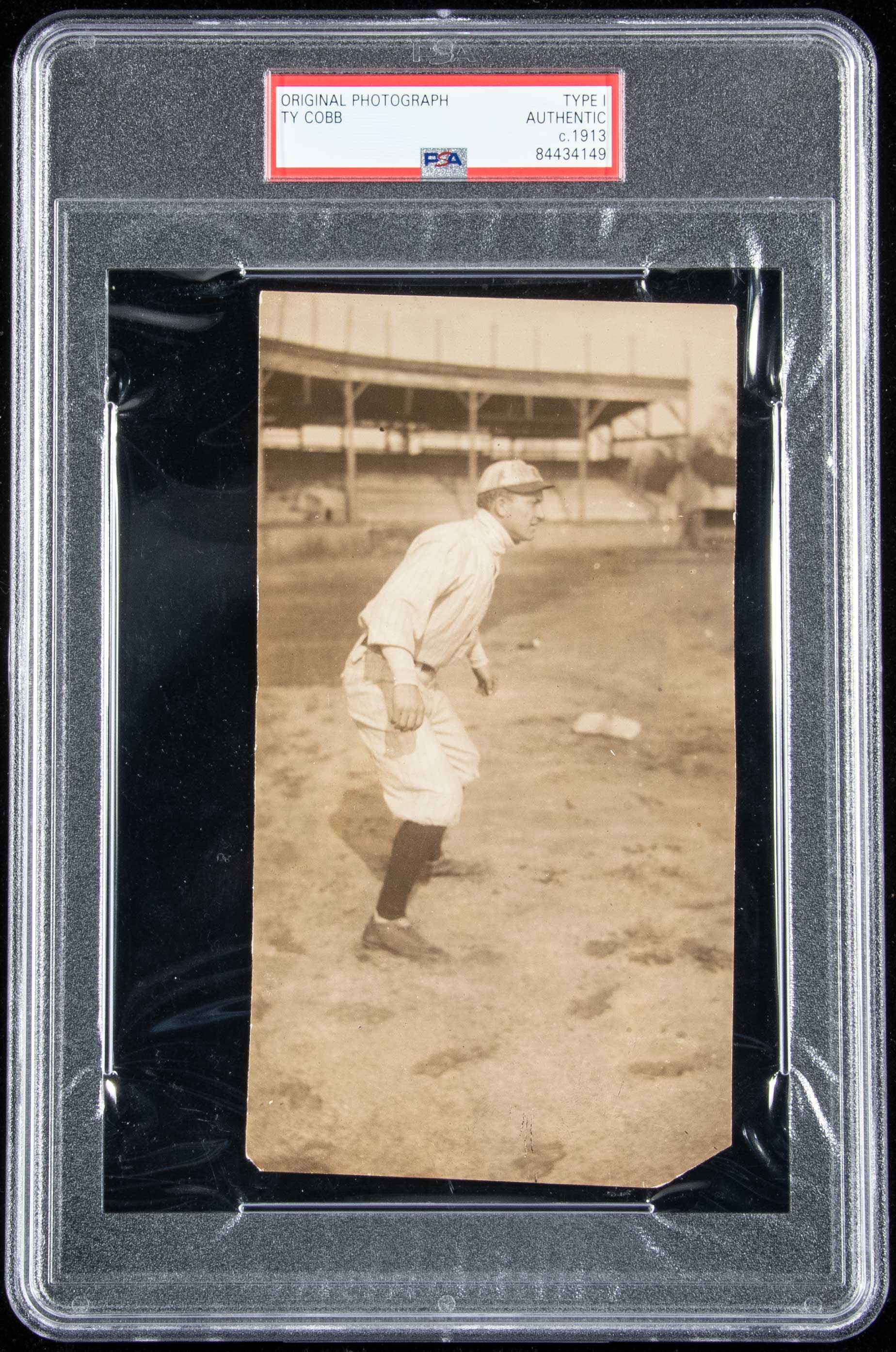 Description:Ty Cobb photograph c.1913 (PSA Type I). Handsome sepia tone image picturing Cobb in base stealing pose wearing Detroit Tigers uniform with grandstands in the background. Uncommonly clean registration for the period with small corner chip at lower right. Back is stamped May 1913 with pencil titling, "Cobb takes long lead off first." 3 5/8"x6 3/4". Includes full letter and is encapsulated by PSA (Type I): EX