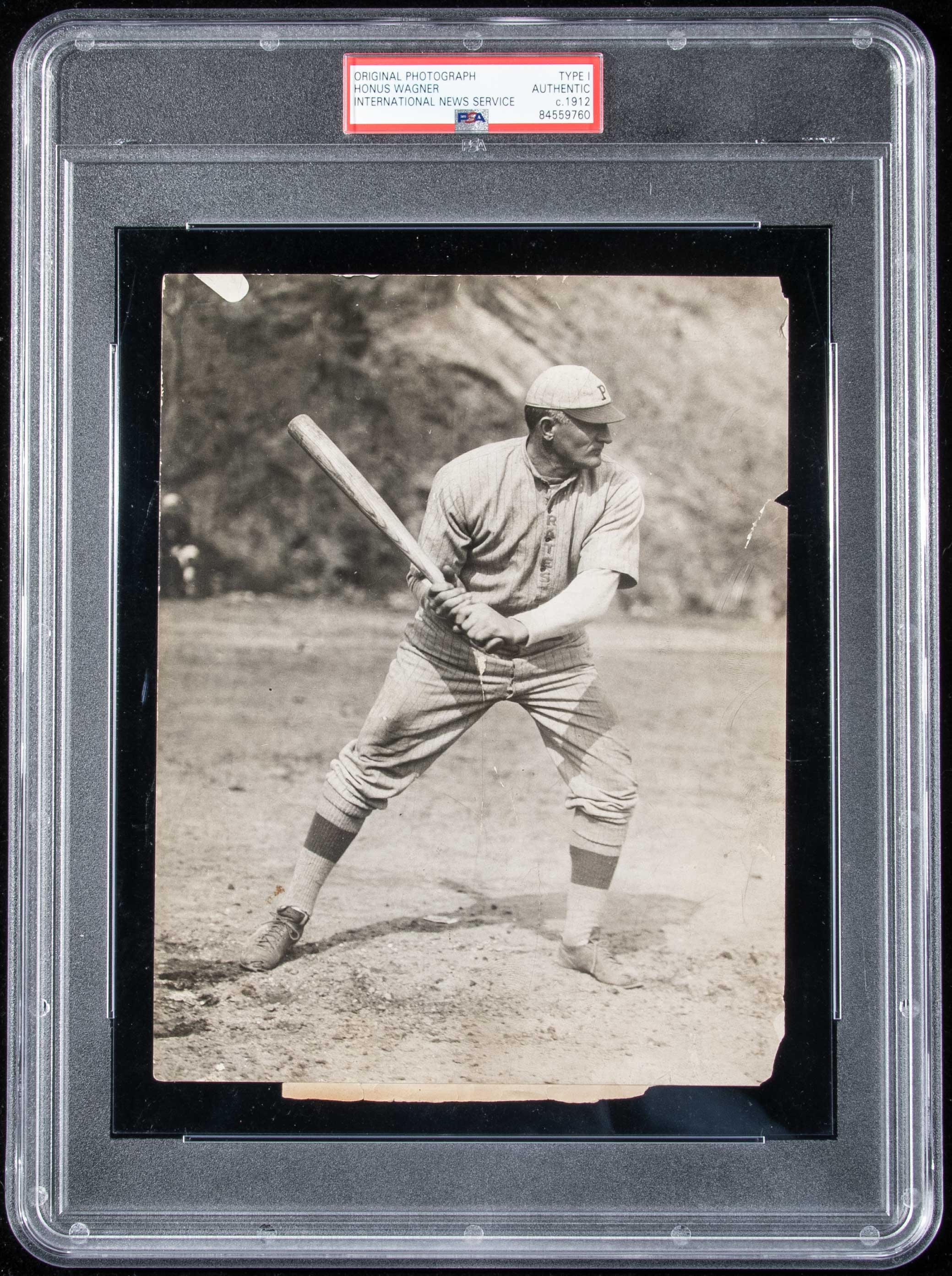 Description:Honus Wagner photograph c.1912 (PSA Type I)(Ex-Baseball Magazine Collection). Black and white 6 3/4"x8 3/4" batting photograph picturing Wagner in full uniform. Exceptional clarity noted with some surface wrinkling throughout in addition to few edge chips/tears. Back is stamped by International News Service with hand written pencil identification. Photo was part of the Baseball Magazine Collection with Christie's hologram affixed to the back. Encapsulated by PSA (Type I): VG