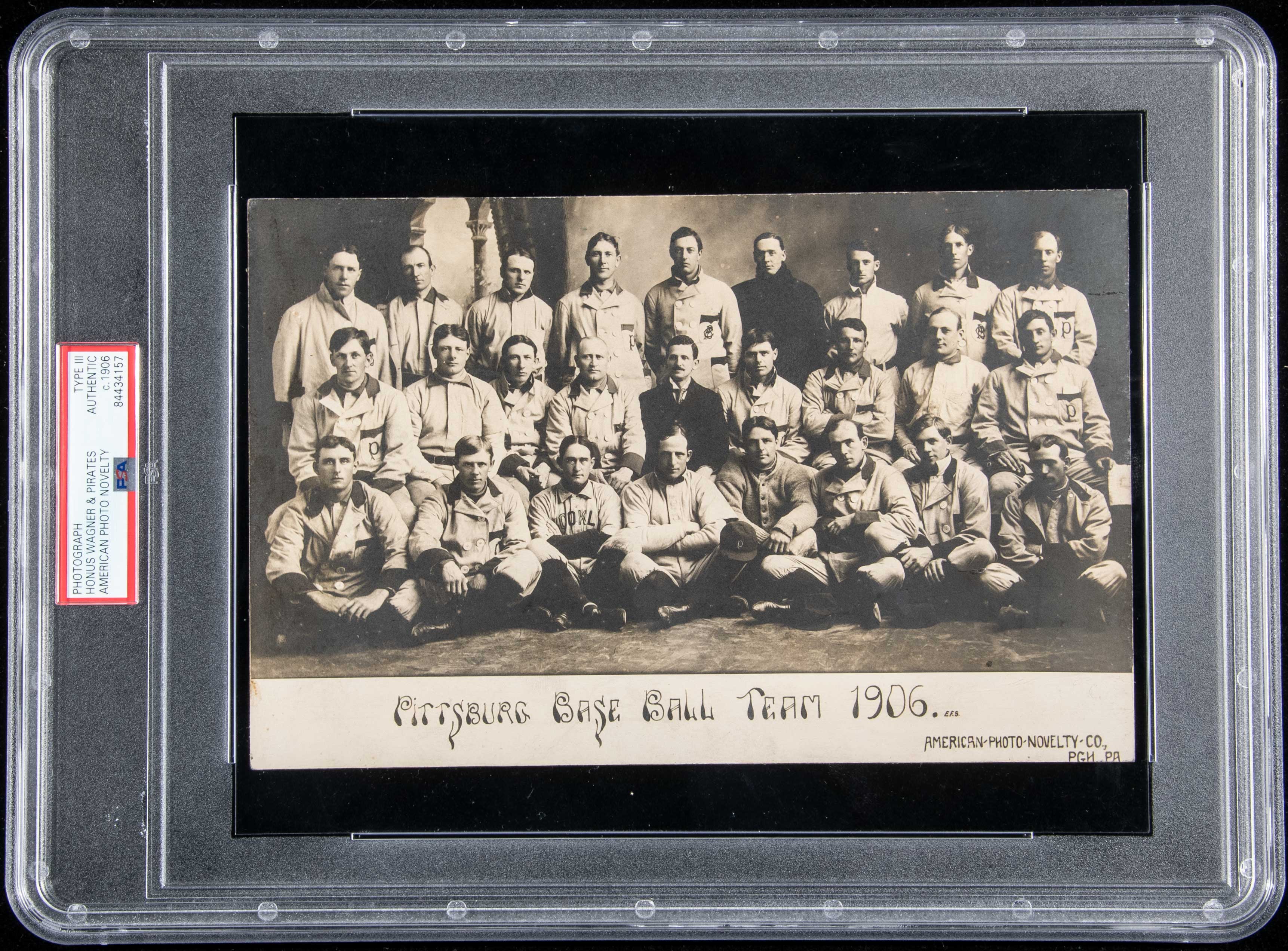 Description:1906 Pittsburgh Pirates team photograph (PSA Type III). Rare 1906 Pittsburgh Pirates team photograph. Choice sepia toned 6"x9" photo showing team members incl. Honus Wagner and Fred Clarke. Captioned "Pittsburgh Base Ball Team" within the lower right border and marked "American-Photo-Novelty-Co." Blank backed with some light silvering and a touch of light age related wear. Uncommon view of the early Pirates team image is one of only a handful we have encountered. Includes full letter and is encapsulated by PSA (UPDATED - Type III): EX-EX/MT