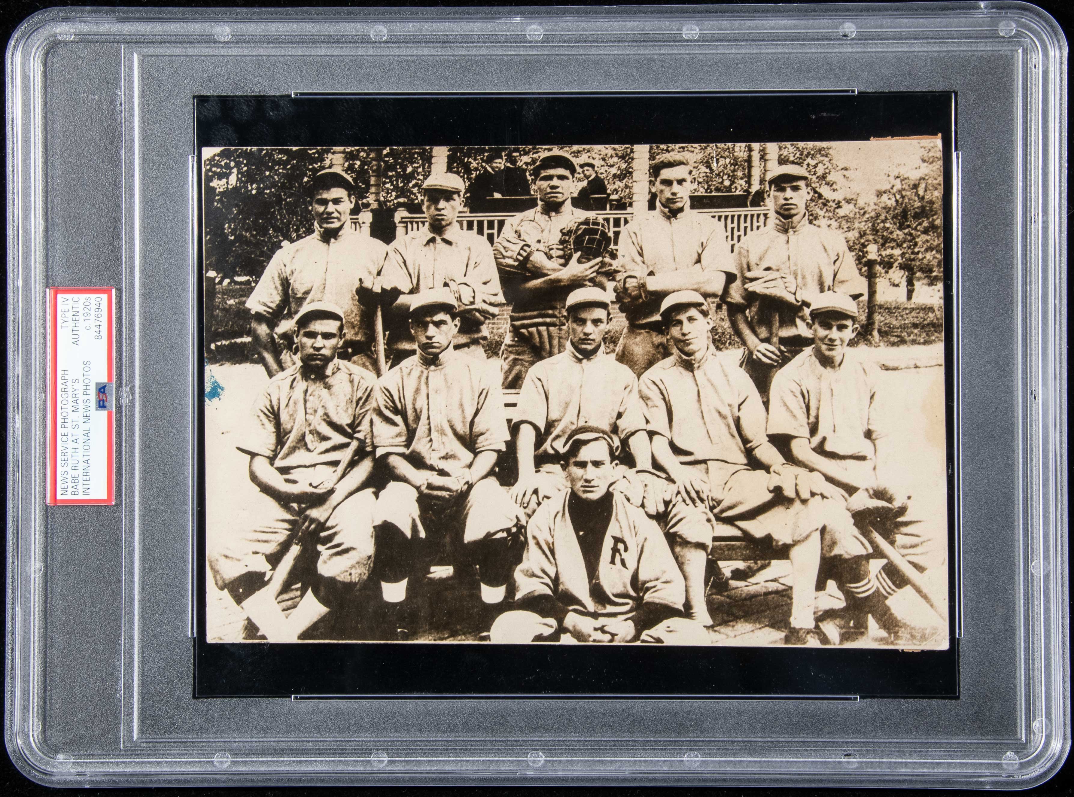 Description:Very rare Babe Ruth St. Mary's photograph c.1920s (PSA Type IV). Seldom offered period image picturing Ruth as a member of the 1912 St. Mary's Industrial School for Boys baseball team. Ruth was a catcher for the team as a teenager and is pictured in the back row wearing full uniform and holding catcher's mask/mitt. Sepia tone photo measures 7"x9" and was printed in the 1920s period exhibiting fine contrast and clarity for its issue date. Reverse has typewritten identification label denoting the use of the image in the 1917 St. Mary's annual reports. Period copies of this important image are exceedingly rare with scant few entering the collecting marketplace. Includes full letter and is encapsulated by PSA (Type I): EX