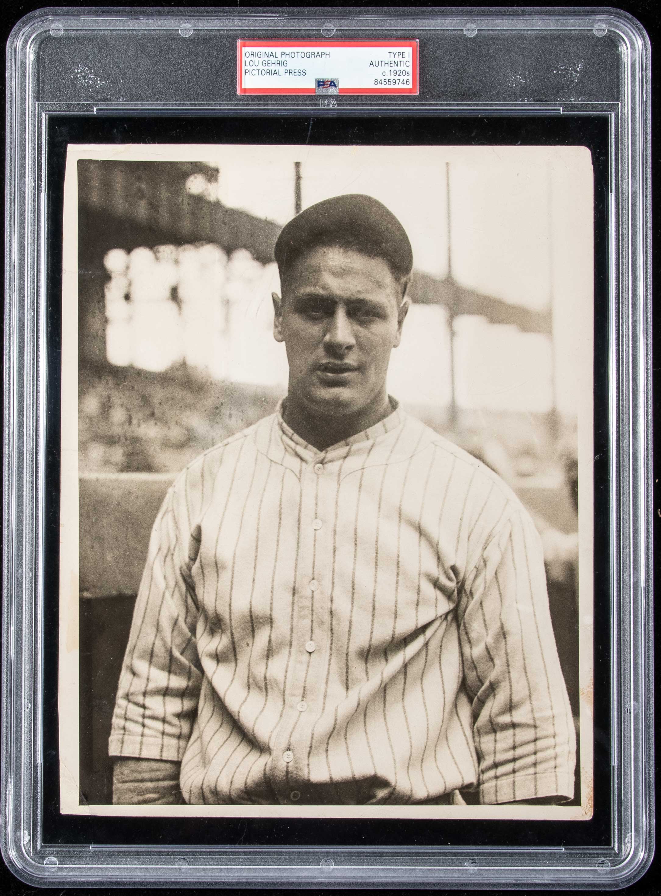Description:Fine Lou Gehrig photograph c.1920s (PSA Type I). Sepia tone 8"x10" portrait image picturing a young Lou Gehrig posed in New York Yankees home uniform. Typical minor surface/edge wear to the front with Pictorial Press stamp on the back as well as period pencil notations and later print date of 1928. Very desirable portrait image dating to the early part of Gehrig's Hall of Fame career. Encapsulated by PSA (Type I): EX
