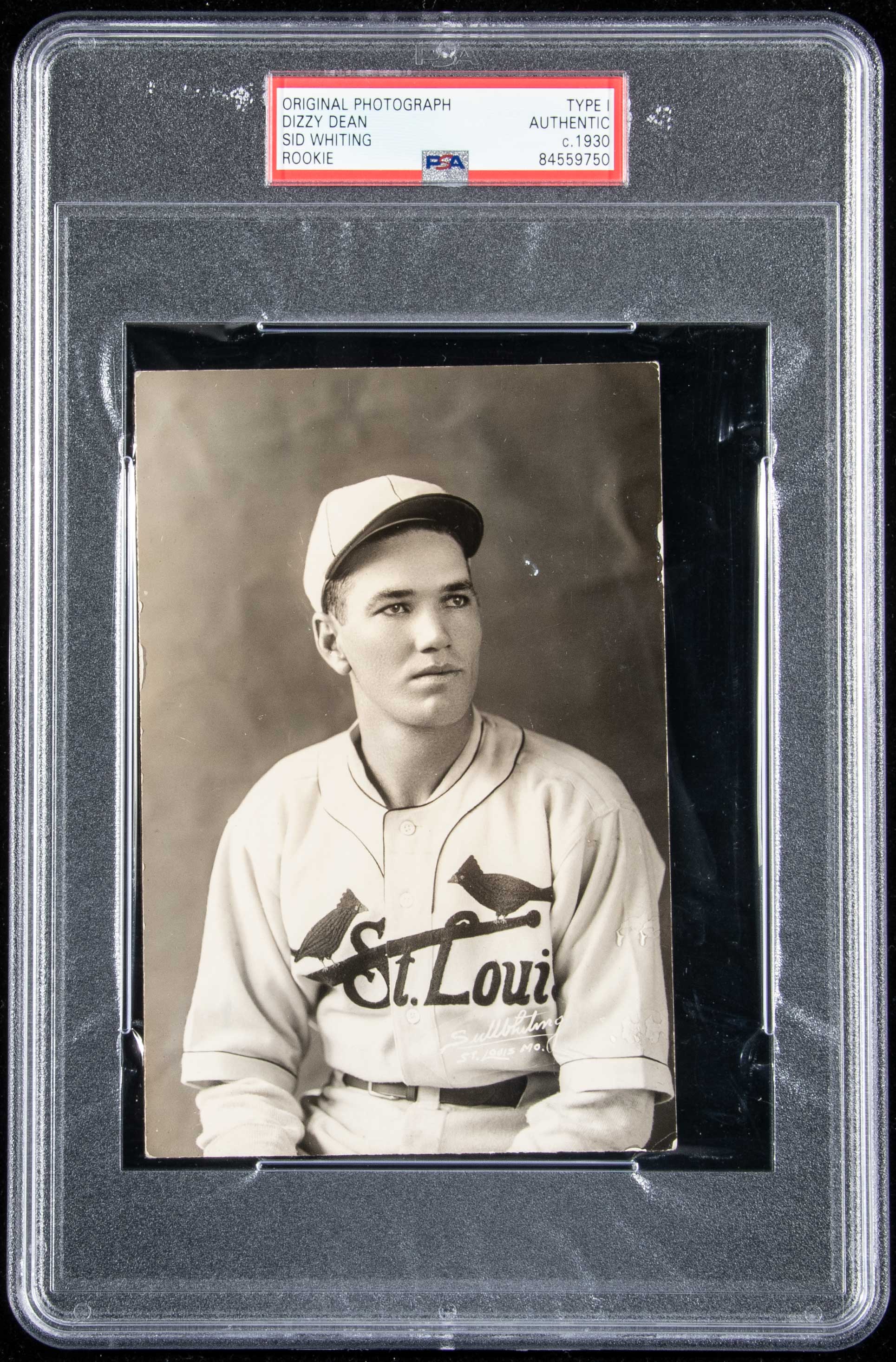 Description:Superb Dizzy Dean rookie photograph by Sid Whiting c.1930 (PSA Type I). Breathtaking original studio portrait picturing a very youthful Dizzi Dean in Cardinals uniform. Marked by photographer Sid Whiting within the image which measures 4"x6". Back is stamped by Whiting with period ink identification and stamped date of use of 1931. Minimal edge wear mentioned for accuracy only. Outstanding rookie era image of the iconic Cardinals hurler. Encapsulated by PSA (Type I): NM