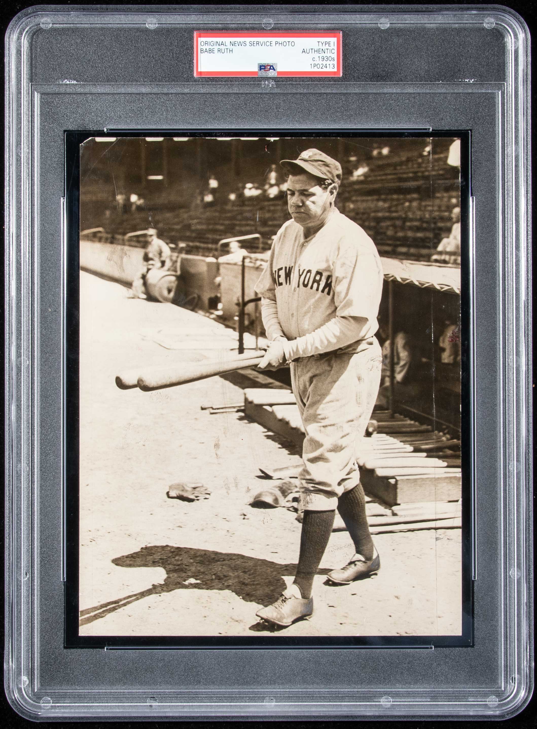 Description:Babe Ruth photograph c.1930s (PSA Type I). Sepia tone 8"x10" image picturing Ruth selecting a bat en route to home plate wearing Yankees road uniform. Corner crease at top left with a vertical cropping line visible at right edge. Back is dated with several stampings of publication including 1934 along with period newspaper clipping affixed. Encapsulated by PSA (Type I): VG-EX
