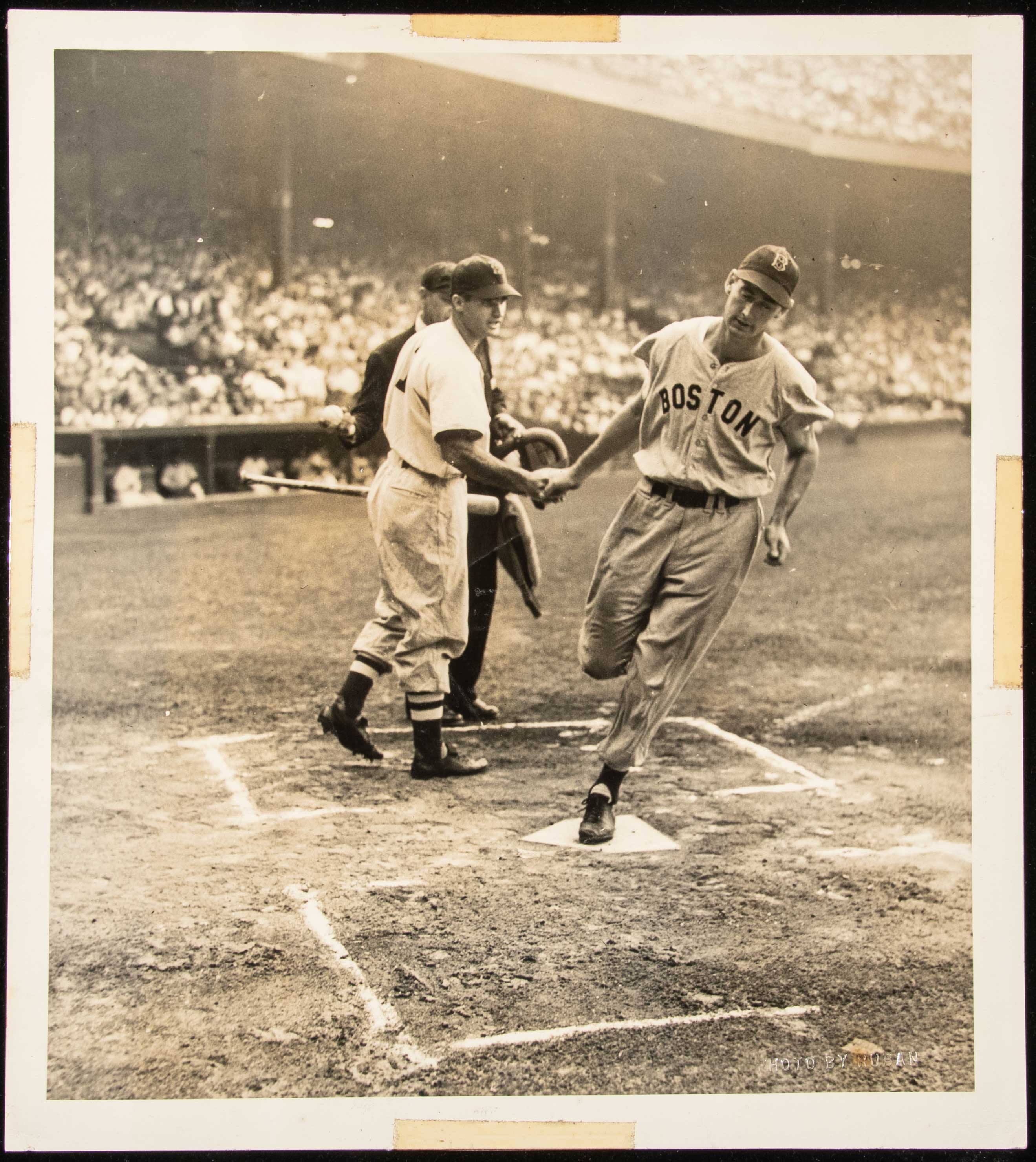 Description:Ted Williams photograph from the Williams Collection c.1940-50s. Large format approx. 11.25"x12.5" sepia tone photo showing Williams being congratulated by fellow Hall of Famer Bob Doerr as he crosses home plate. Light wear to the image portion which has a few minor wrinkles and there is some vintage/toned tape in the white borders on all sides. "Photo by Ruban" impressed stamp at lower right. Includes certificate of provenance from the Ted Williams Collection: VG