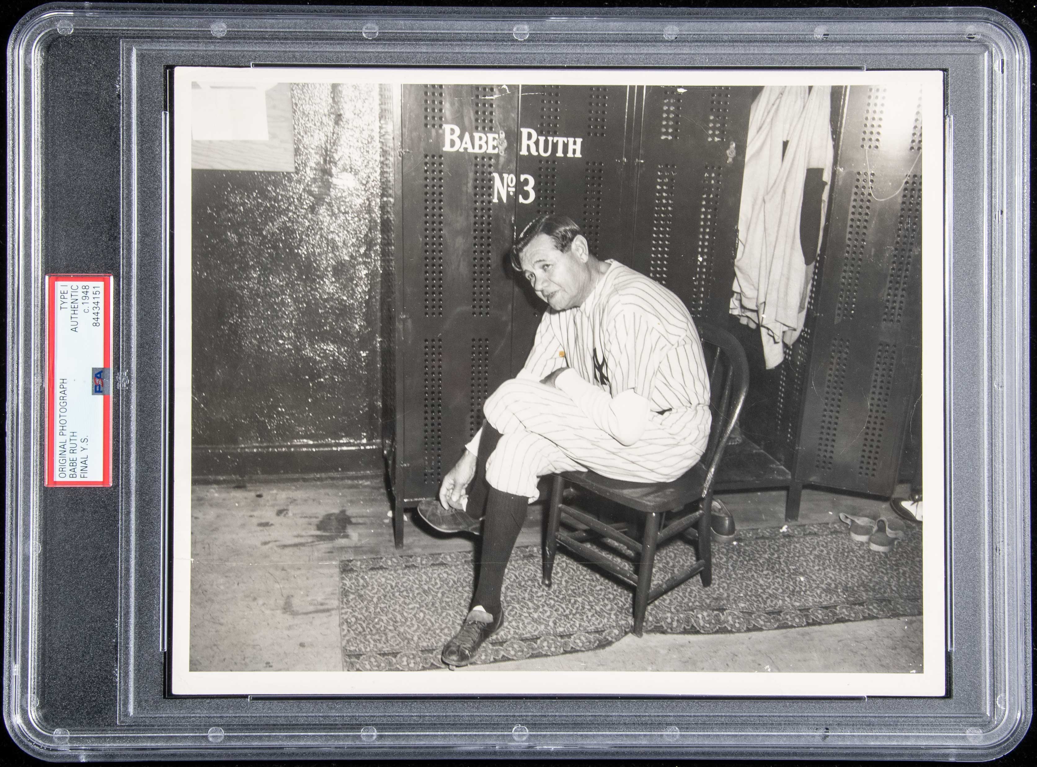Description:June 13, 1948 Babe Ruth Final Appearance at Yankee Stadium photograph attributed to Ruth's personal photo album (PSA Type I). Iconic 8"x10" black and white image picturing Ruth seated at his locker at Yankee Stadium on the occasion where he appeared for the final time. Clarity and contrast are nearly flawless vividly portraying the Babe in his frailty having been ravaged by throat cancer. The photo originated from the Barry Hapler collection and was attributed to having been removed from the photo album personally presented to Ruth after the event. Includes full letter and is encapsulated by PSA (Type I):NM