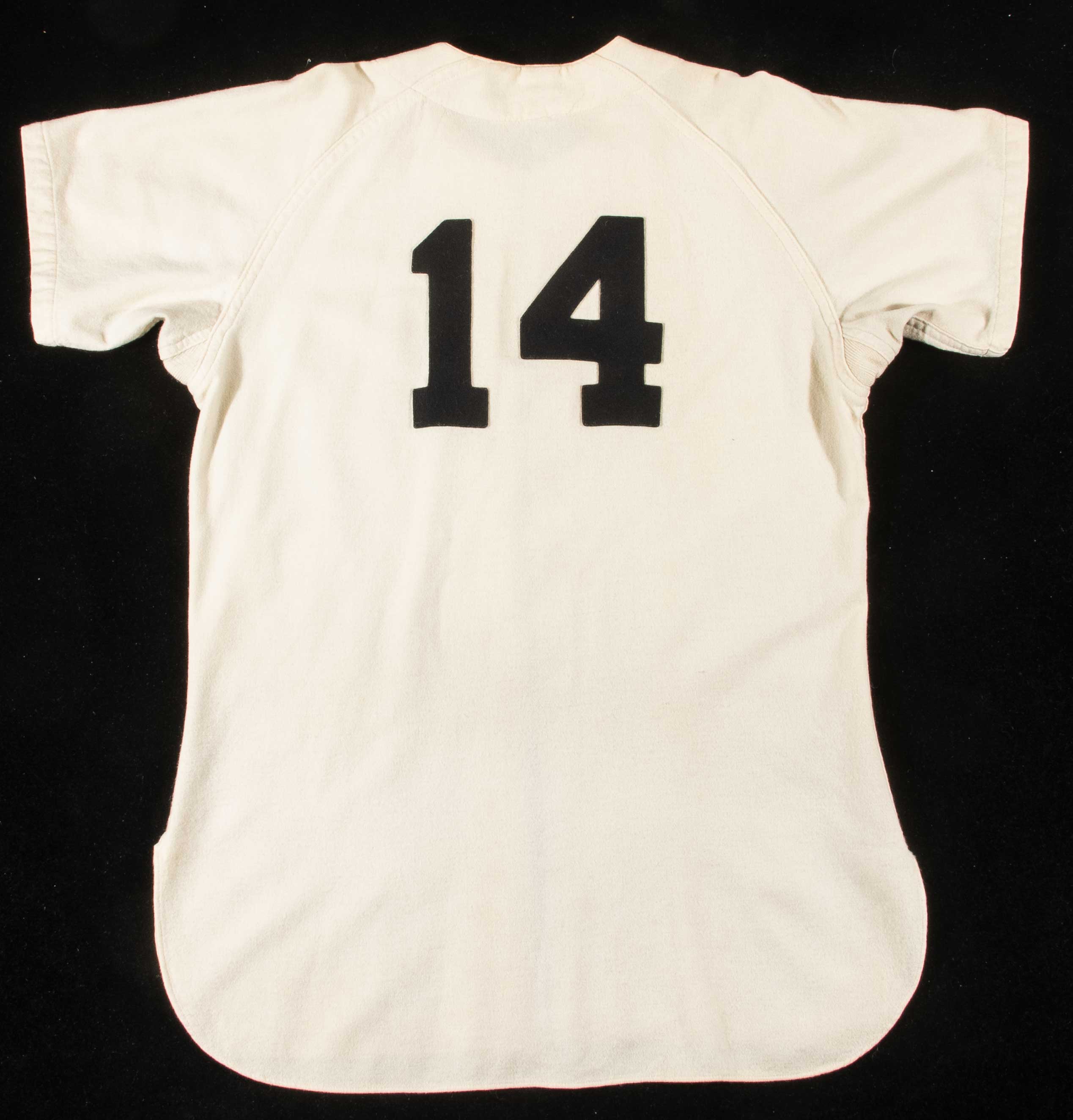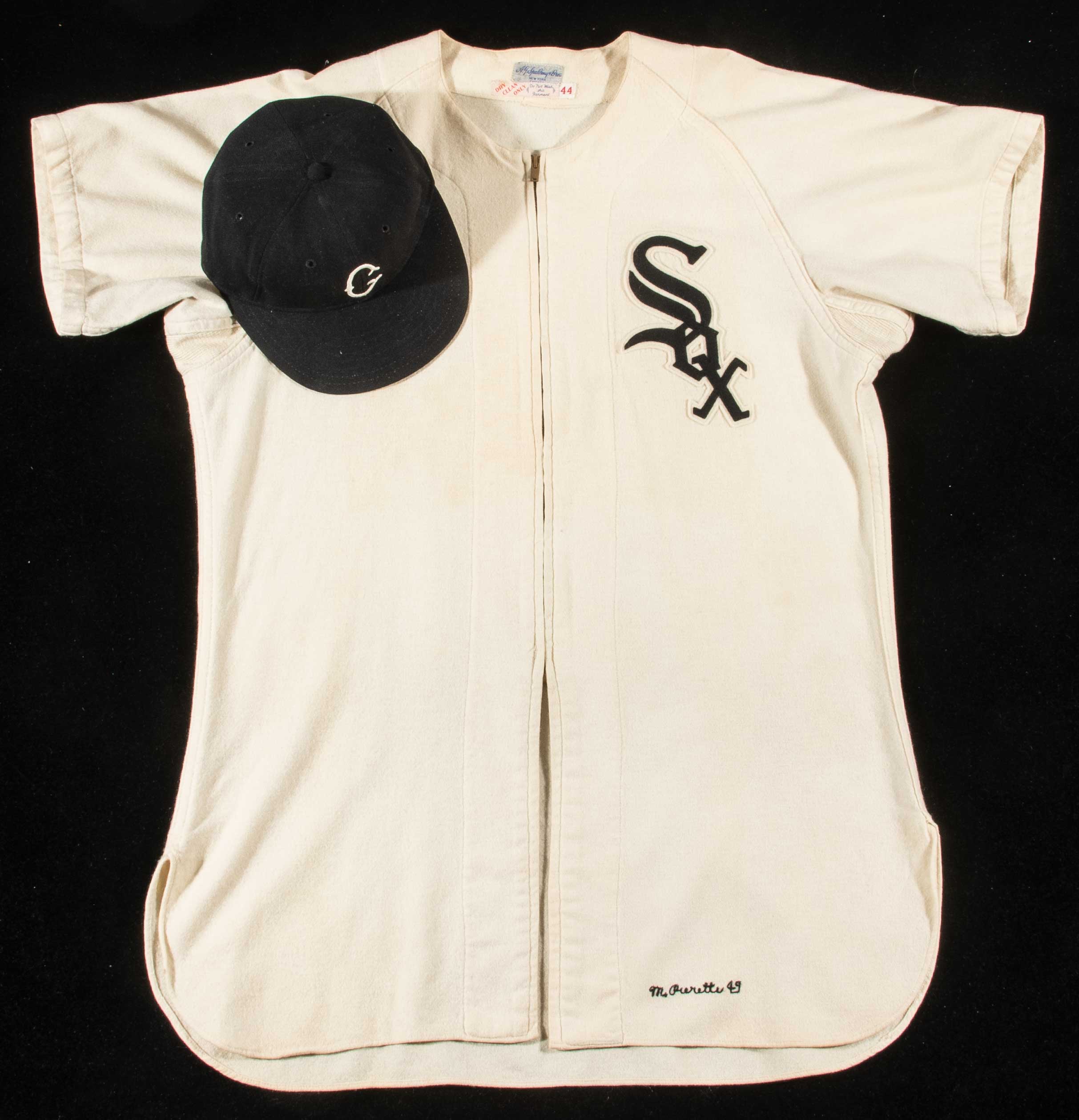 Description:1949 Marino Pieretti Chicago White Sox professional model home jersey with related hat. Cream color flannel zipper front jersey with original "Sox" felt emblem on front having matching "14" on back. A.G. Spalding manufacturer's label affixed inside the collar area with additional dry clean and size 44 supplemental tags. "M/Pieretti 49" chain stitched in black at bottom of tail front. Shirt presents in very fine original condition with appropriate use/wash wear. Lot also includes 1949/50 White Sox hat as issued to Hank Majeski retaining A.G. Spalding tag on interior along with red chain stitched "Majeski" identifier. Includes LOA from Hunt Auctions: EX
