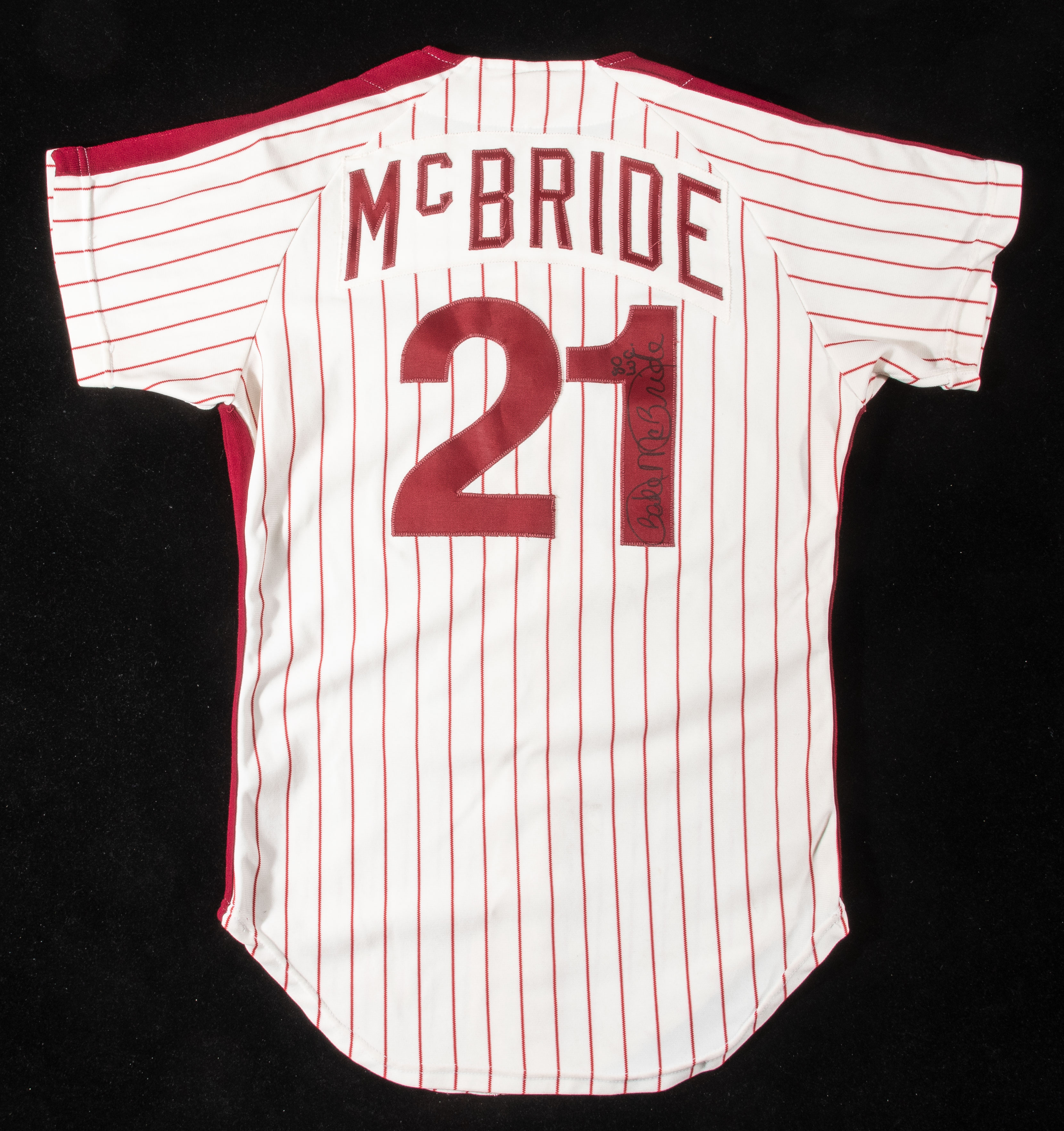 Description:1980 Bake McBride autographed Philadelphia Phillies professional model home jersey (World Championship season). Pinstriped jersey has the Phillies "P" team logo on front and number "21" on back below a "McBride" nameplate. In the collar is a "McBride" embroidered strip tag and an additional on the front tail reads "80 2" (denoting year and set number). Just above is a Wilson size (42) tag. Signed on the back number in marker rating 8 out of 10. In outstanding overall condition with appropriate use and wash wear. A highly desirable all original jersey from the Phillies Championship season. Includes auction LOA from JSA and LOA from Hunt Auctions: EX"