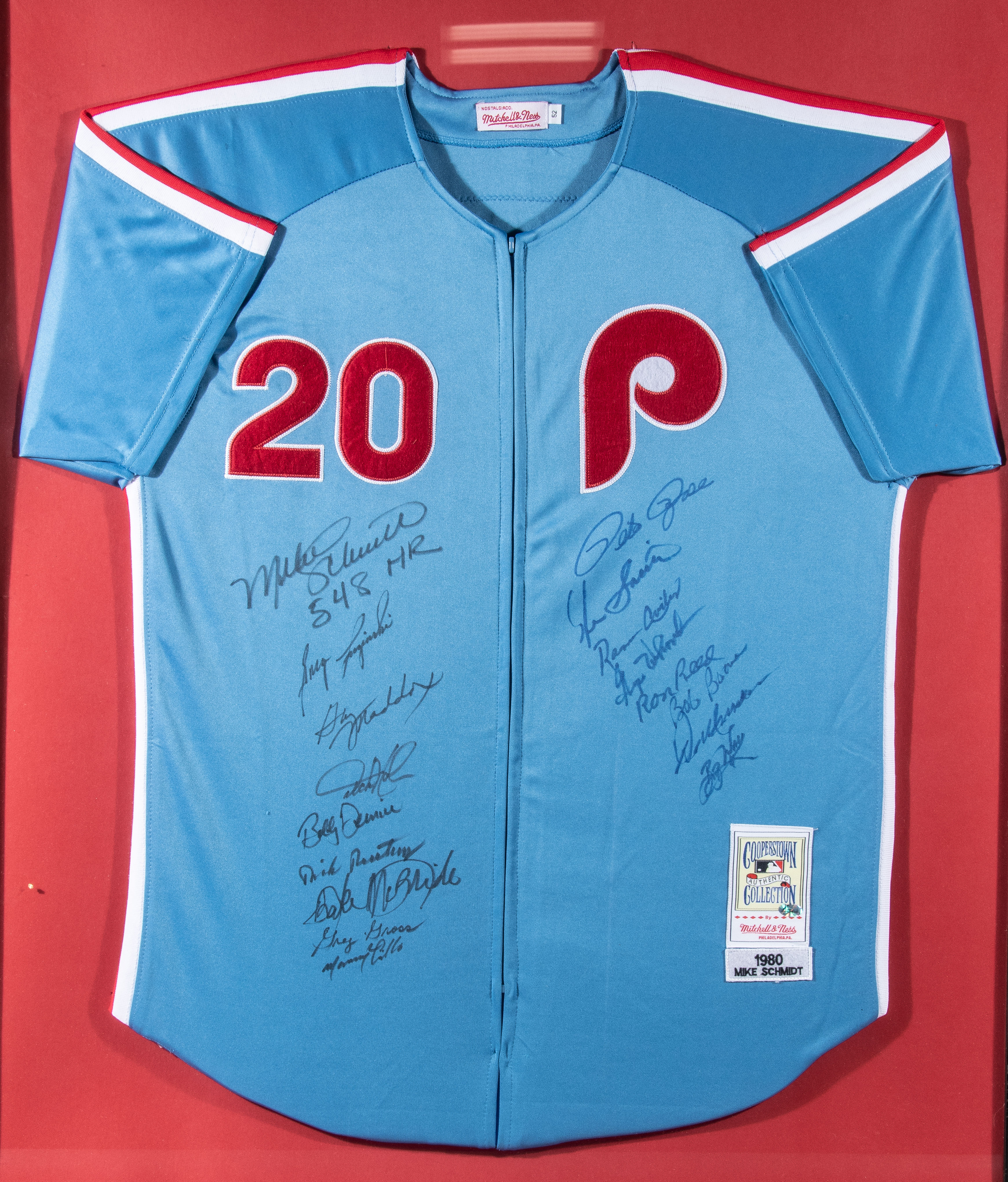 Description:1980 Philadelphia Phillies autographed throwback jersey (World Champions). Approx. 34.5""x42" framed Mitchell & Ness 1980 style Mike Schmidt jersey signed by (17) members of the World Series champions including Schmidt with "548 HR" inscription, Pete Rose, Manny Trillo, Bake McBride, Garry Maddox, Bob Boone, Greg Luzinski, Ron Reed, Dick Ruthven, Del Unser, Bob Dernier, Greg Gross, George Vukovich, Ramon Aviles, Dickie Noles, Bob Walk, and Kevin Saucier. Signatures rate 7/8 to 9/10 out of 10. Due to framing, complete condition is unknown. Includes JSA auction LOA: NM appearance