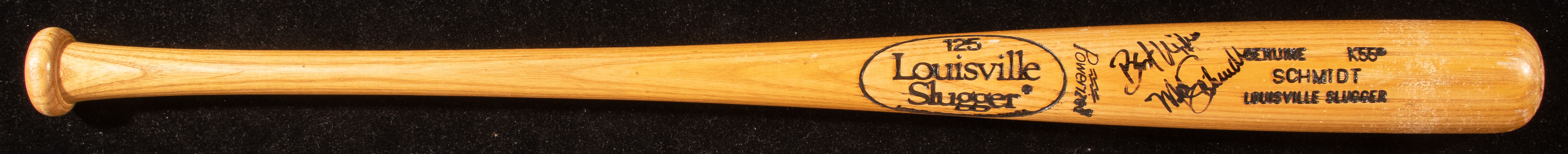 Description:Mike Schmidt autographed professional model baseball bat c.1980s. Louisville Slugger 125 model bat measures 35" long and weighs oz. The bat shows some surface wear but no visible evidence of game use. Model number K55 stamped on barrel end with "Best Wishes Mike Schmidt" signed in black sharpie. Includes LOAs from Hunt Auctions (bat) and JSA (autograph): Bat: EX-MT, Signature: NM"