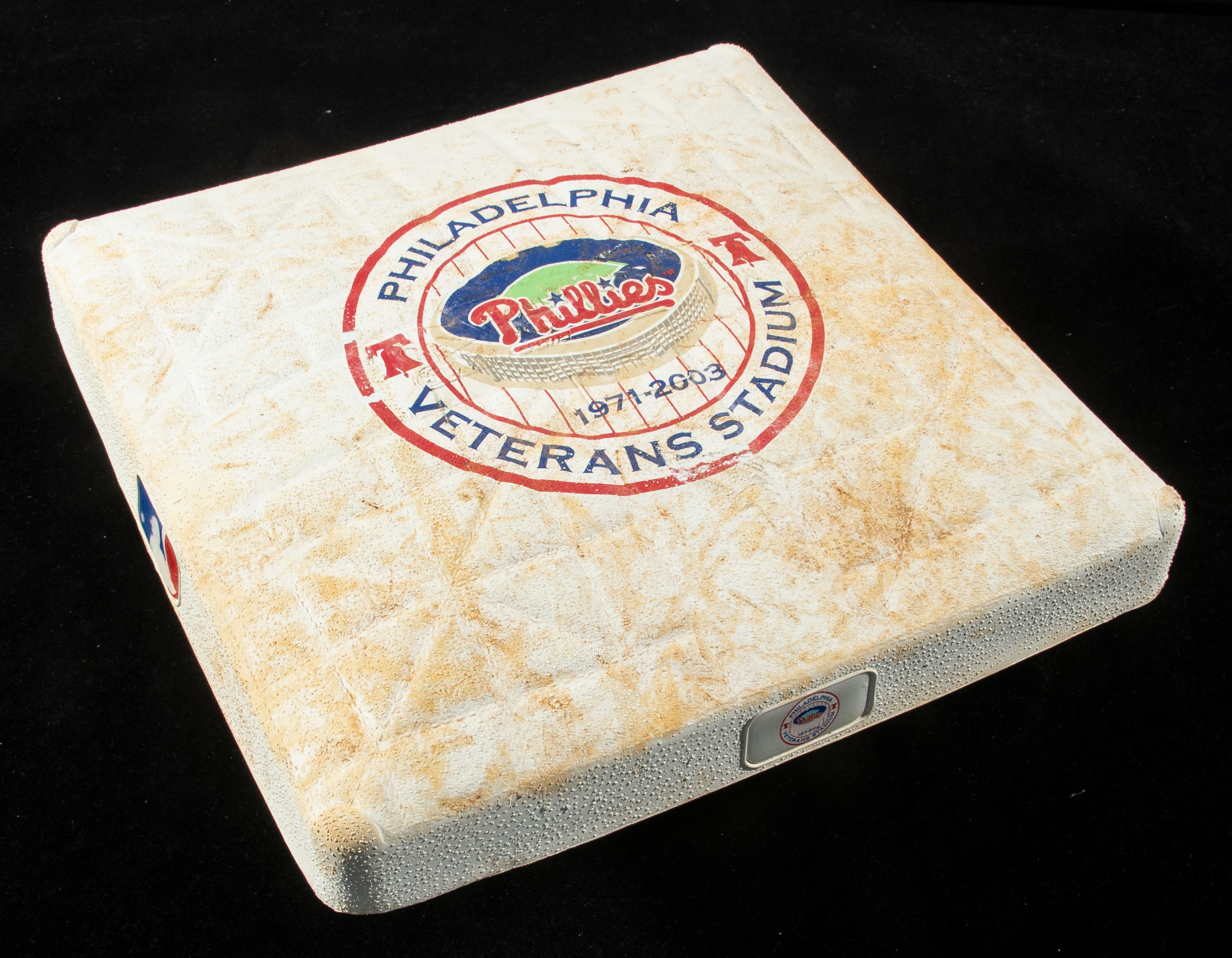 Description:2003 Veterans Stadium final season game used base (MLB Authenticated). Final season logo base used during the September 1st game between the Phillies and Red Sox (Jimmy Rollins HR). MLB Authenticated serial #MT00236025 hologram sticker is on the base. Visible use with soil residue on the surface: EX