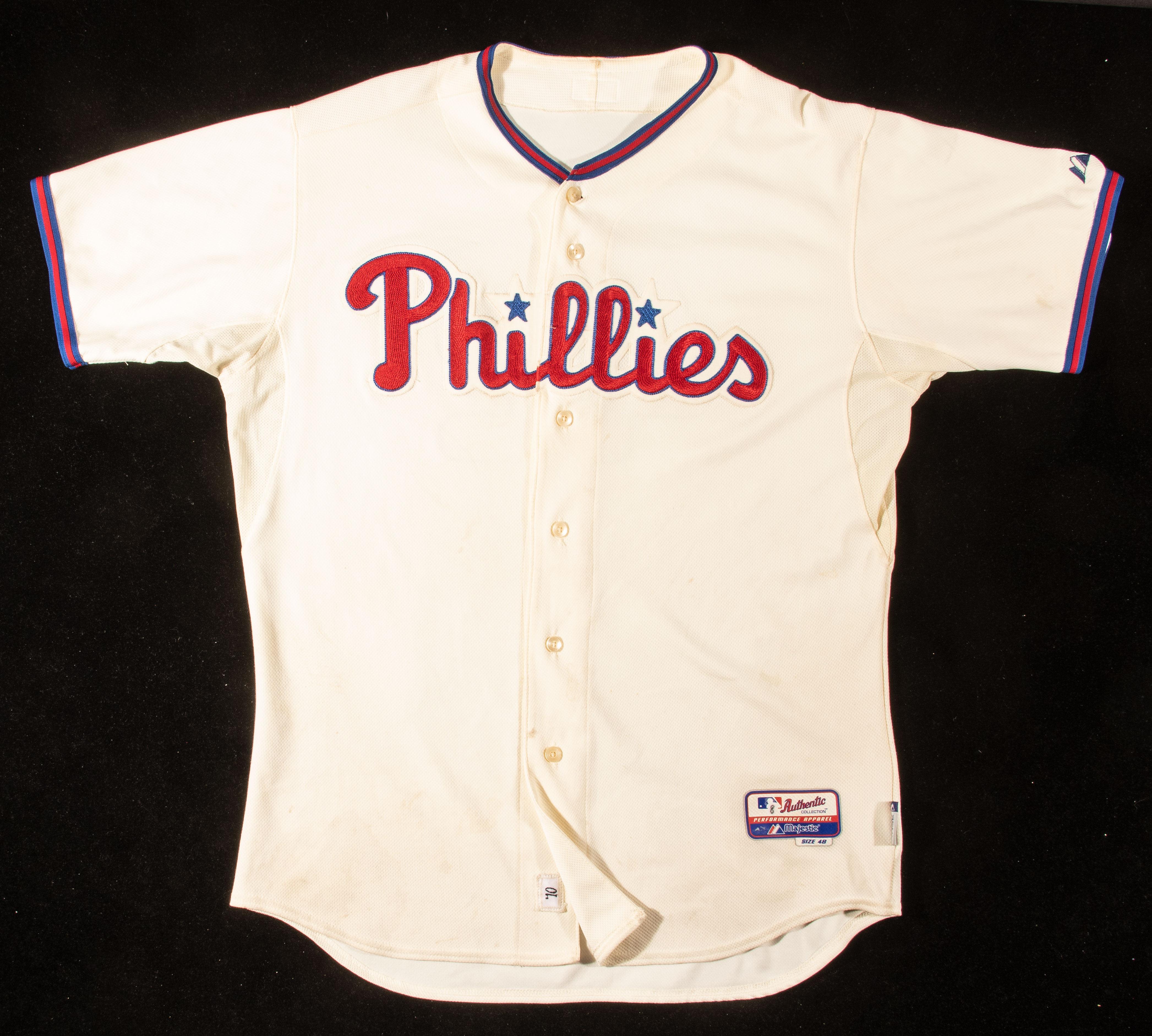 Description:2010 Shane Victorino Philadelphia Phillies Jackie Robinson Day game worn home alternate jersey (Phillies Auction Receipt). Cream color Phillies home alternate jersey as worn by Shane Victorino on Jackie Robinson Day having embroidered team name across the front with "42" on back as worn by all MLB players to honor Jackie Robinson. Proper Majestic Authentic tagging on tail front with "8" written in black marker signifying Victorino's regular uniform number and vestiges of hologram adhesive (likely MLB Authentication). "10" chain stitched strip tag on inside of shirt indicative of the year with proper wash code on dry clean tagging. Evident use is visible including several areas of soiling spots. Victorino was a key member of the Phillies 2007-2011 championship teams. Includes LOA from Hunt Auctions and copy of original receipt from the Phillies Auction purchase: EX