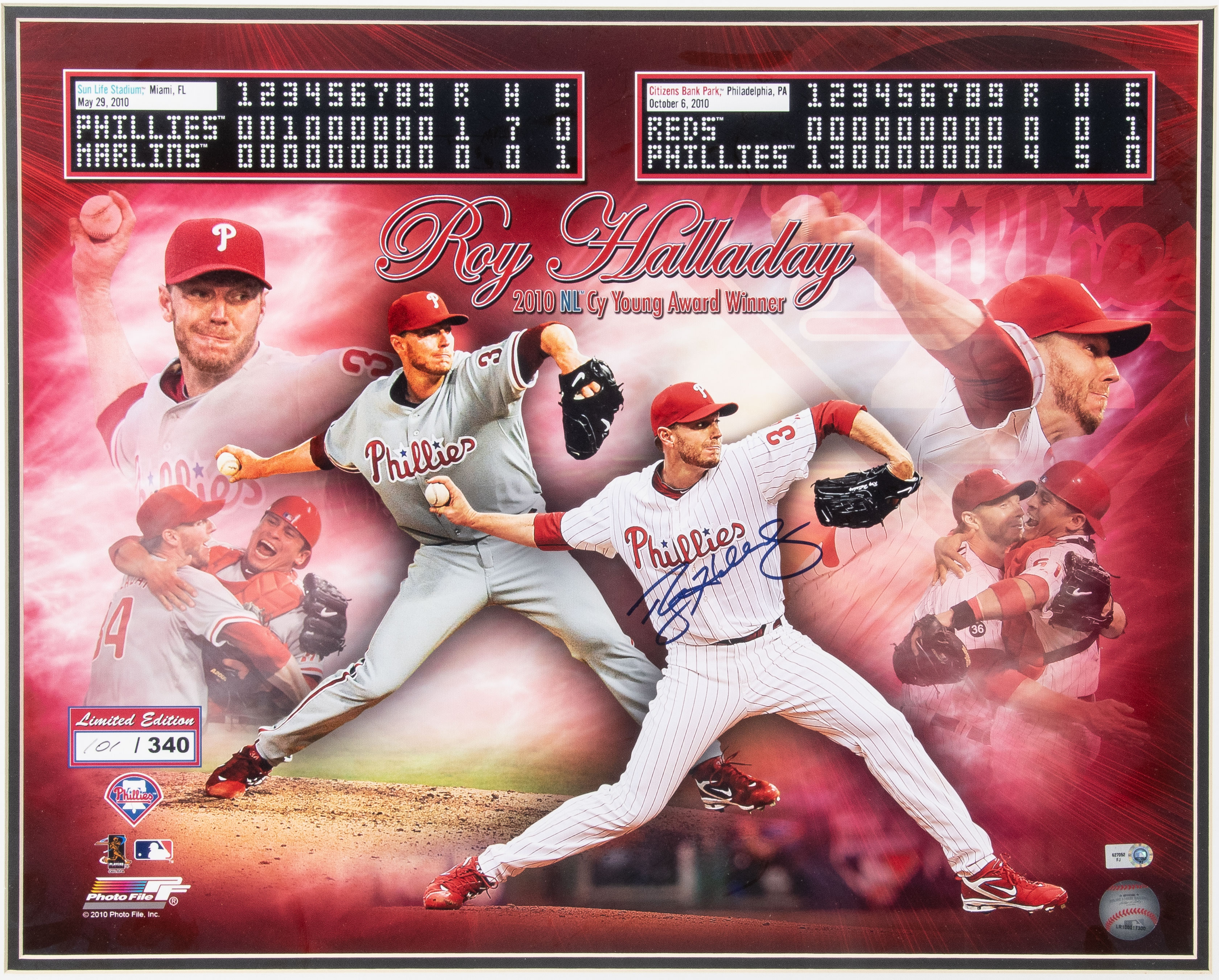Description:Roy Halladay autographed limited edition photograph. Approx. 22.5""x26.5" framed 16""x20" photo signed by Halladay in blue marker. Signature rates 9/10 out of 10. The photo is #ed 101/340. Due to framing, complete condition is unknown. MLB Authenticated serial #ed hologram sticker is affixed: NM appearance