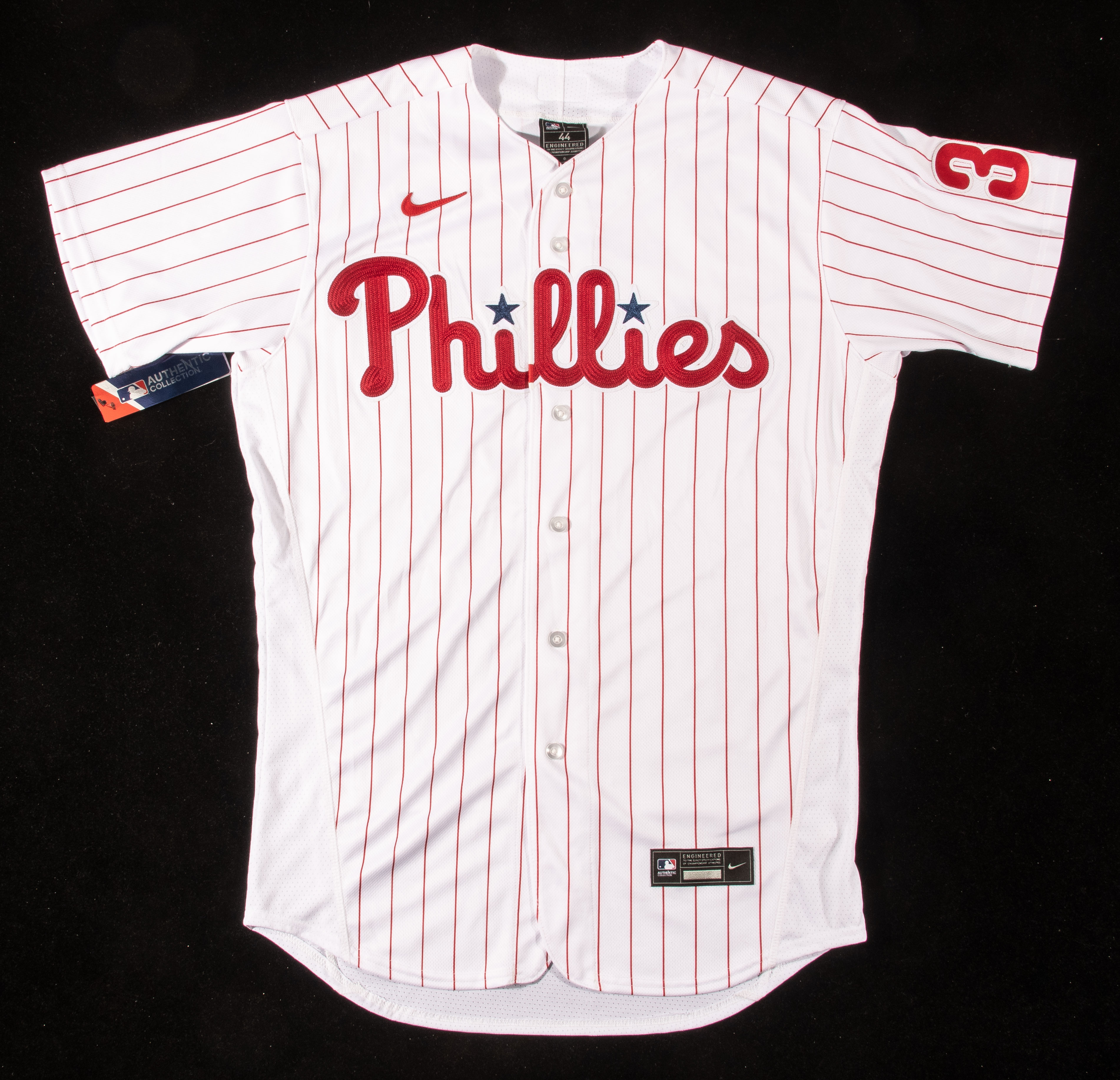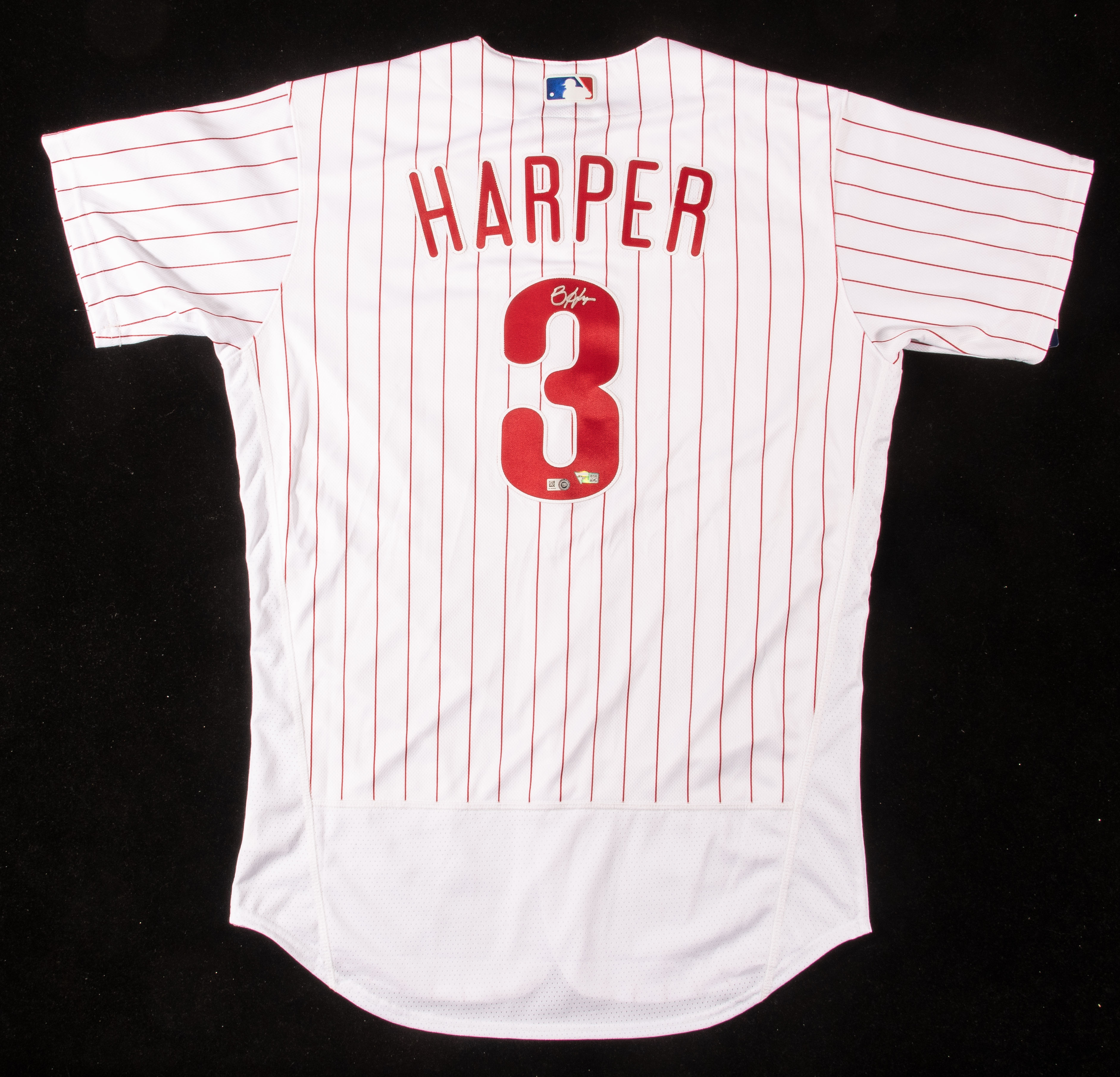 Bryce Harper autographed Philadelphia Phillies authentic jersey (MLB Authentication). Phillies pinstriped home white MLB Authentic professional model jersey signed by Harper in silver on the back. MLB Authentication hologram affixed: MT