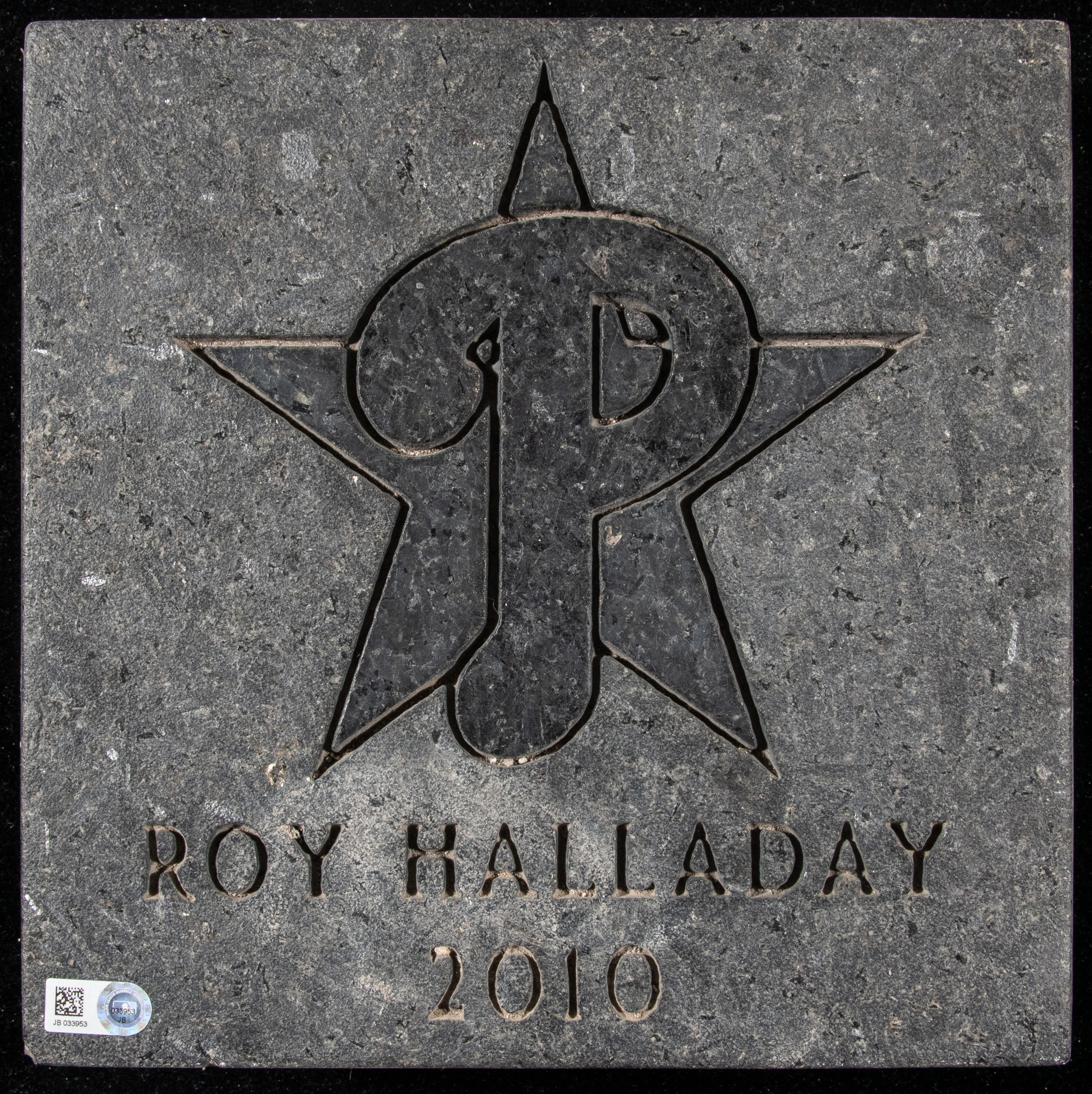 Description:Roy Halladay Citizens Bank Park commemorative paver (MLB Authentication). Original cast stone paver issued for Roy Halladay with date of 2010 impressed on front beneath printed name and star graphic. The paver was removed from the Ashburn Alley area of Citizens Bank Park during renovations in 2016. 8" square with expected surface wear. MLB Authentication hologram affixed: EX