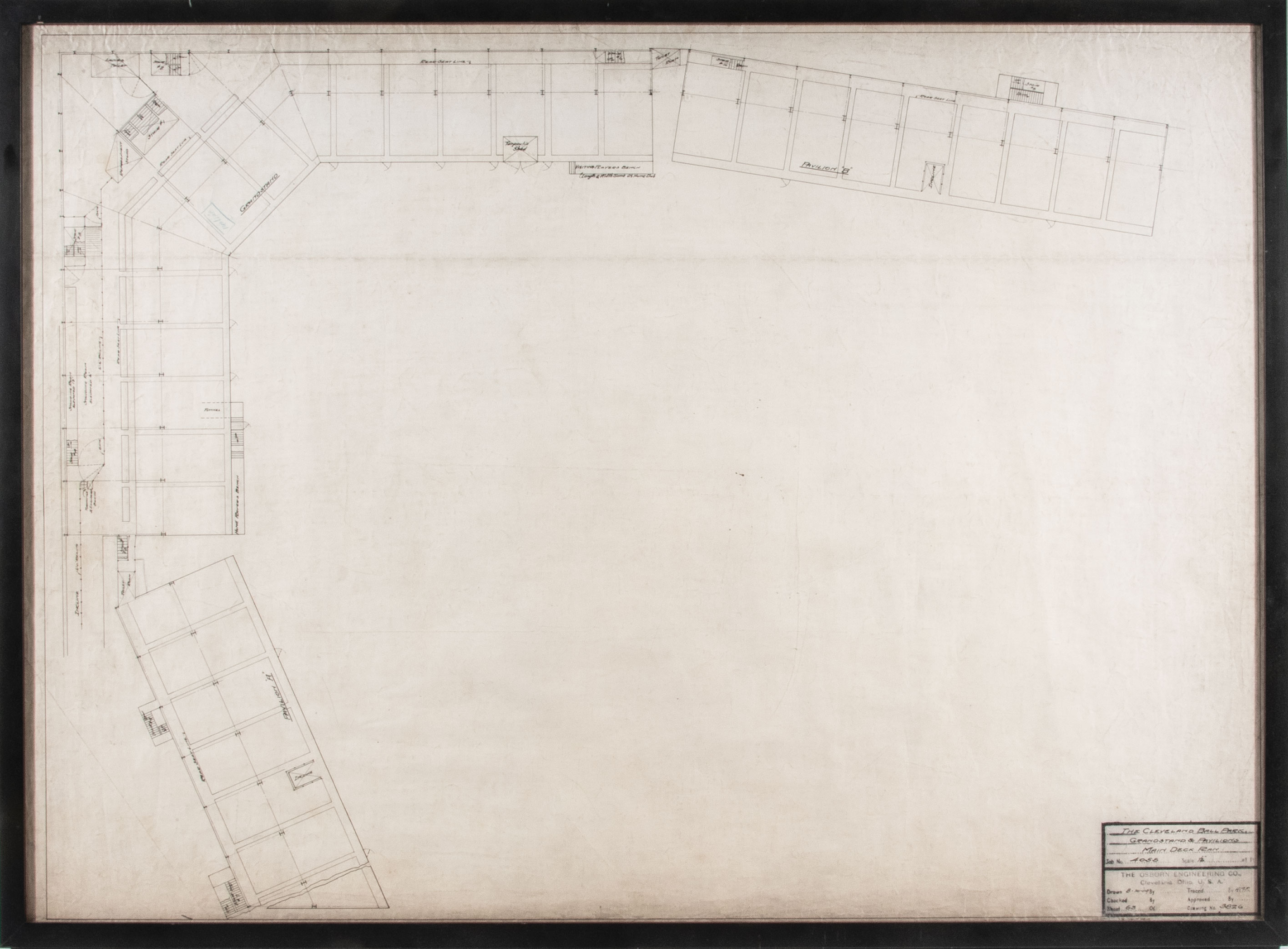 Description:1909 Cleveland Indians League Park renovation "Main Deck" blueprint. Original blueprint by Osborn Engineering done for the 1909-1910 renovations which were undertaken at League Park in Cleveland. Shown are the plans for the "Grandstand & Pavilions, Main Deck" with both the home and visitors dugouts noted. Framed to 37.25"x27" with typical fold lines and some light wrinkling: EX