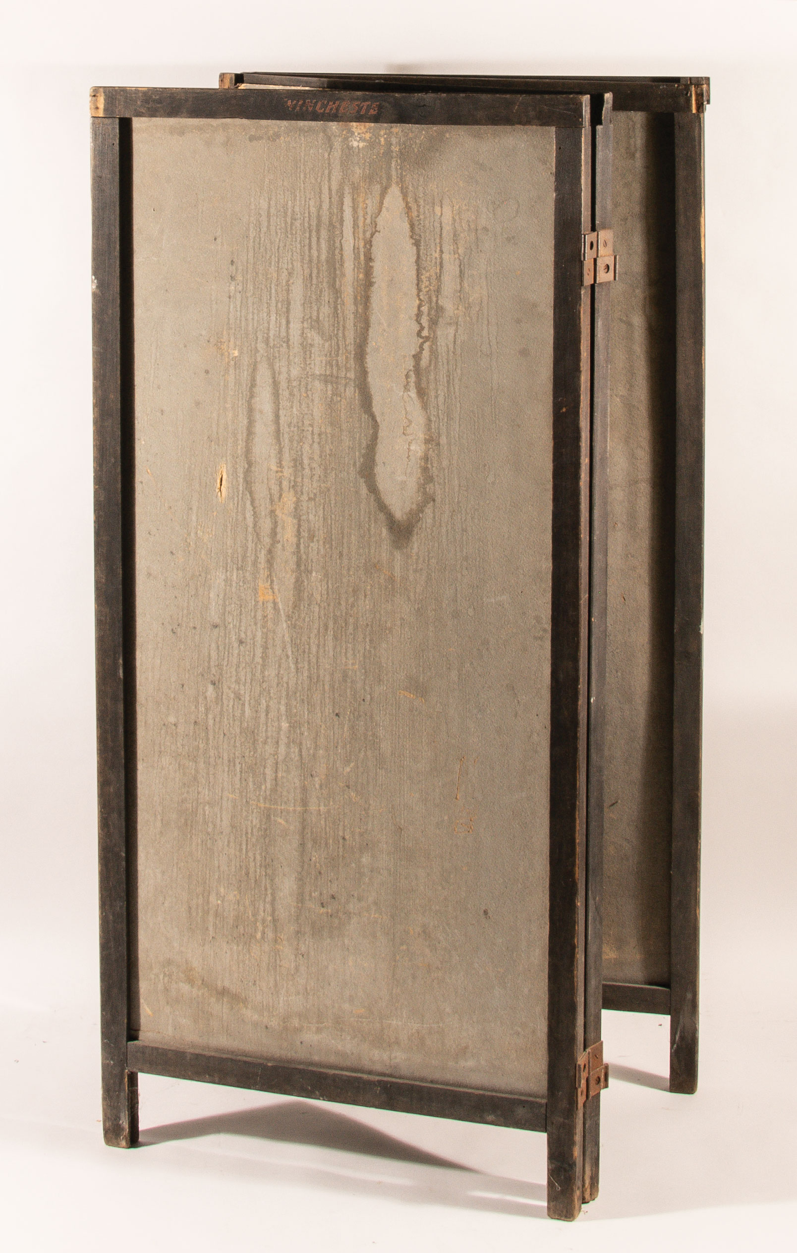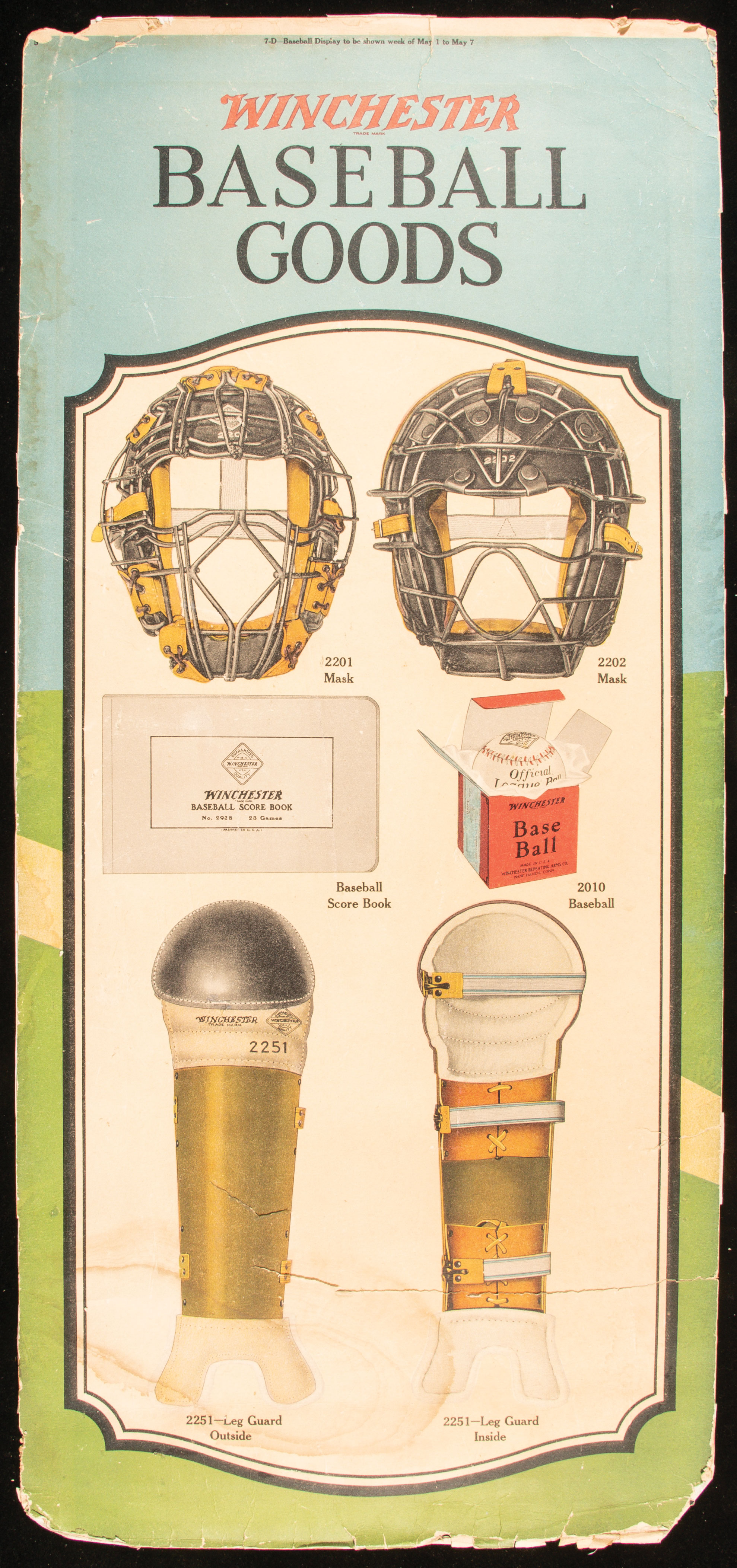 Description:"Winchester" baseball equipment advertising panel with original wooden tri-fold display c.1915-1920. Large format 18.25"x40.25" store display on heavy stock featuring color images of their lines of catchers masks and shin guards. Displays well with bold color however there are areas of heavy wear/chipping including some loss along the lower edge and there is a very heavy crease/crack about 7" up from the bottom (this extends around 3/5ths of the way through the piece starting at the right edge). Includes a rare original wooden (3) section hinged display in which the panel (and others in the series) would be displayed in a retail setting. The display is free standing and functional with scattered wear including some chipping to the wood. "Wincheste" (missing the "r") is lettering along the upper slat on one side and there is one small slat missing: See description