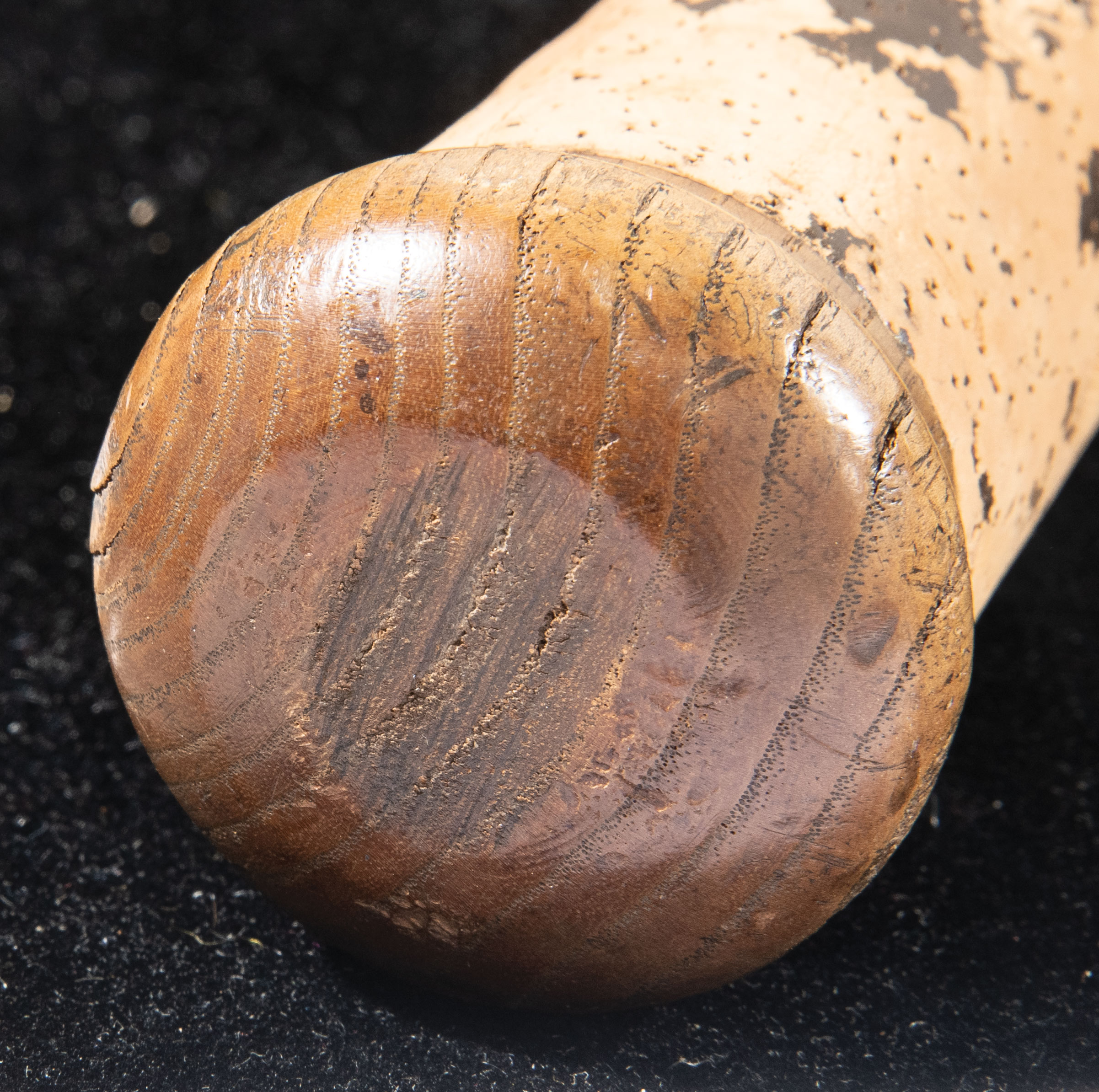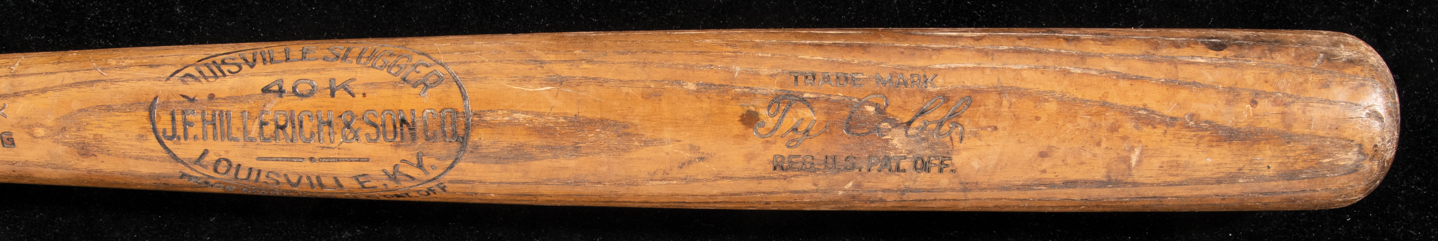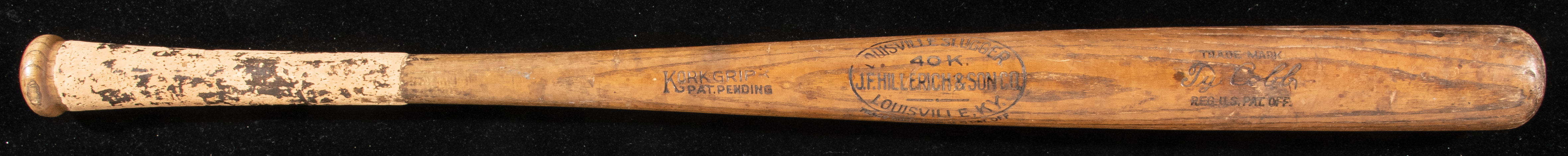 Description:Ty Cobb professional model baseball bat c.1913-14 - PSA "GU 7.5" Louisville Slugger model 40K bat with dash-dot-dash centerbrand and Cobb facsimile signature in the barrel measures 34" long and weighs 35.3oz. "Kork Grip Pat. Pending" is burned in just above the handle and the overwhelming majority of the factory applied cork remains in place. In addition there appears to be a light coat of gripping substance applied just after the cork ends on the upper handle. Cobb was well known to have applied tape to bats to aid in grip and was personally involved in developing the cork grip with Hillerich & Bradsby. Nice use is evident throughout with minor grain swelling (due to repeated contact) to the hitting surface and there are several ball and cleat marks visible. A slight handle crack is noted by PSA. The dating period of manufacture, 1913-14, was determined by a comparison of centerbrand characteristics and the "Pat Pending" notation (with regard to Kork Grip) which changed to the patent number awarded after approval in September of 1914. In all regards which could be measured the bat compares favorably to specific caliper measurements recorded in H&B factory records for Cobb's preferred model and weighs within acceptable tolerances for lighter bats that were made for and shipped to him. The length, 34", is half an inch shorter than one would typically expect to find on a Cobb game bat however John Taube has addressed this anomaly within the included documentation. Further, he notes that bat lengths were not dutifully recorded at this time and the 34.5" length with which Cobb is commonly associated is based only on measurements of well documented bats that have previously surfaced. A desirable bat dating to the heart of Cobb's career and the heart of a string of (13) seasons in which he lead the American League in hitting an astonishing (12) times. Includes LOAs from Hunt Auctions and PSA/DNA (GU 7.5): EX