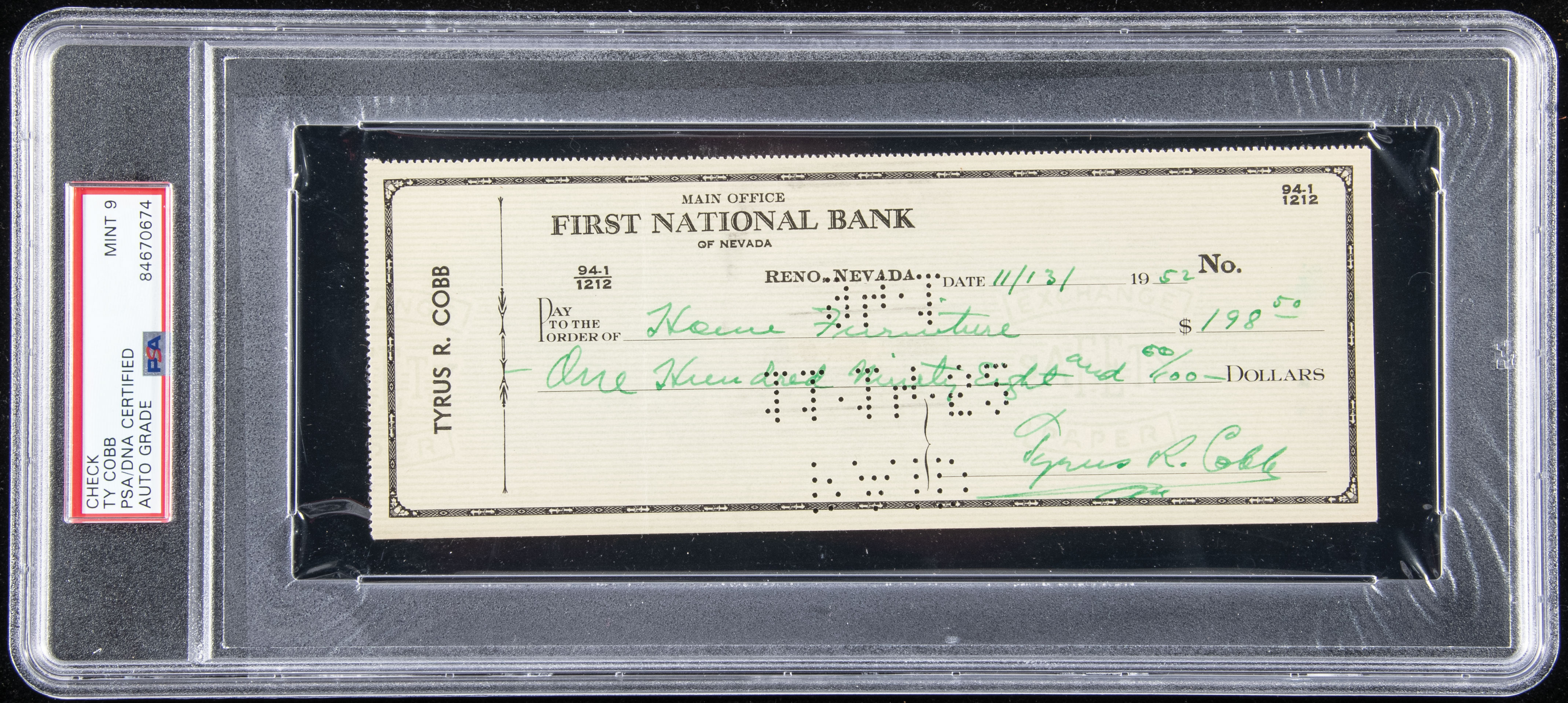 Description:Ty Cobb autographed personal check (PSA/DNA 9 MINT). Dated 11/13/1952 personal check executed and signed by Cobb in his classic green ink. Signature is superb with no affecting cancellation stamping rating 9 out of 10. Encapsulated by PSA/DNA (9 MINT): MT