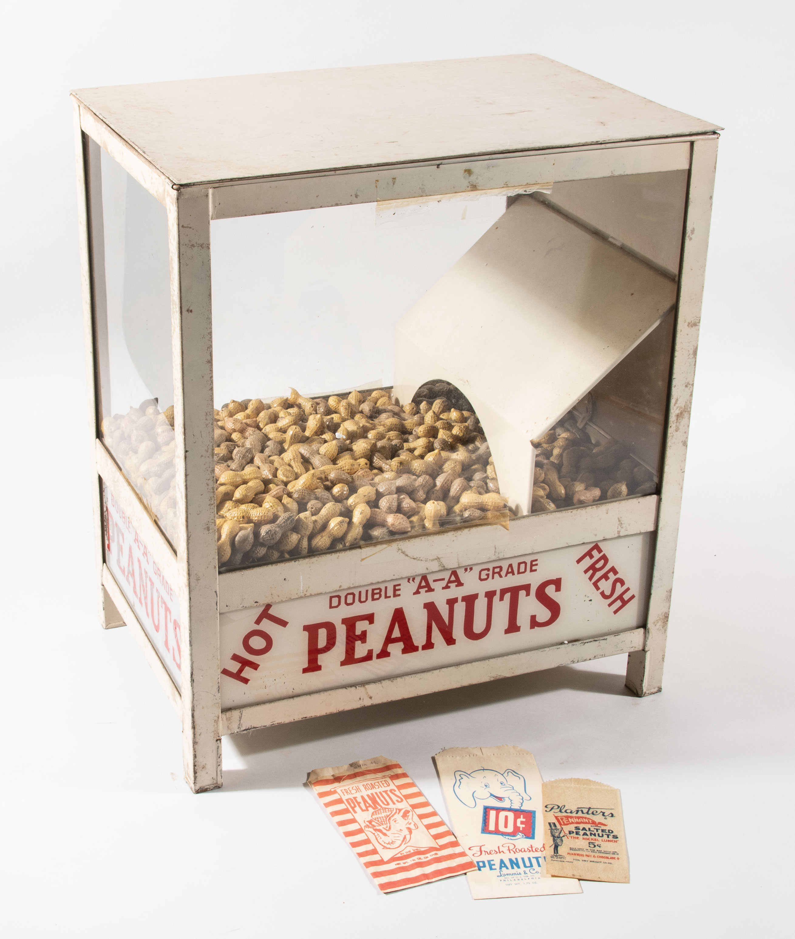 Description:Vintage stadium style peanut warmer c.1930s-1940s. Table top peanut warmer retaining original white frosted glass at lower portion of (3) sides advertising, "Double A-A Grade Hot Fresh Peanuts." Fourth side has a pair of metal doors with upper allowing for removal of peanuts and lower access to light bulb (in working order). Metal enclosure retains the majority of its original white finish with light to moderate wear/loss at areas. The end portion of lower glass has wear/loss to titling, side pieces remain nearly as issued in the period. Fine display qualities standing just over 22" tall with footprint of 13.5"x19.5". Includes a trio of vintage paper/glassine peanut bags (VG-EX): EX
